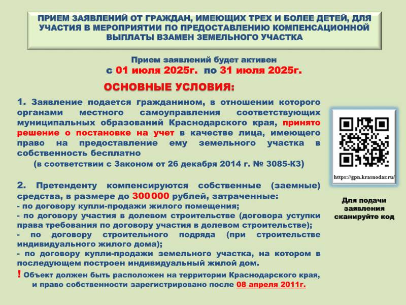 Прием заявлений от граждан, имеющим трех и более детей, дли участии в мероприятии по предоставлению компенсационной выплаты взамен земельного участка |
