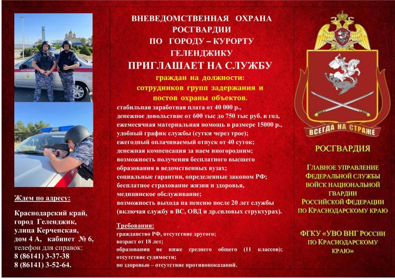 Вневедомственная охрана Росгвардии по городу – курорту Геленджику приглашает на службу |