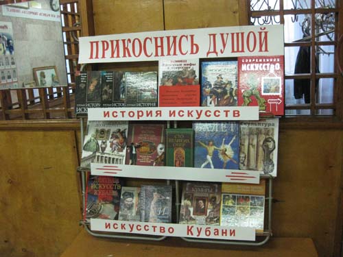 Ночь искусств, РДБ, 3.11.13 г.3 ноября 2013 года по инициативе Министерства культуры РФ прошла первая акция «Ночь искусств». Работники РДБ приняли участие в этой акции. Для посетителей Центра детского творчества экспонировалась говорящая книжная выставка «Прикоснись душой». Она познакомила желающих с историей зарождения искусства, театра, кино. С выдающимися деятелями искусств России и Кубани. Так же на выставке можно было ознакомиться с современным искусством, в каком направлении оно развивается. Всего посетило выставку 120 человек. | |