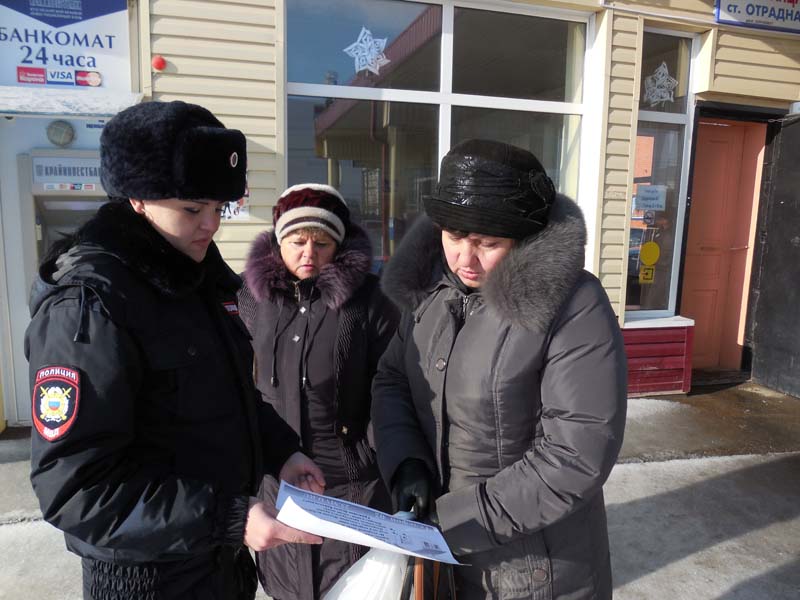 | В целях профилактики имущественных преступлений на территории края и в нашем районе с 15 по 24 января 2014 года проводится профилактическая промо-акция «Листовки личной безопасности». Сотрудники полиции Отдела МВД России по Отрадненскому району совместно с членамиОбщественного совета при ОМВД России по Отрадненскому району распространяют листовки среди населения. В местах массового скопления граждан (рынок, автостанция и др. места) участники акции раздали лично листовки жителям станицы Отрадной, разместили на информационных стендах. Провели беседы как не стать жертвой преступлений. Участковые уполномоченные полиции Отдела МВД распространяют профилактические листовки на обслуживающих административных участках района. Листовки содержат информацию о том, как обезопасить себя от преступных посягательств. Напомнят, какие меры необходимо принимать, чтобы избежать карманных краж, квартирных краж и краж мобильных телефонов.Продолжится акция до 24 января. Член Общественного совета при ОМВД Г.В. Иванов, прокомментировал, что акция очень нужна, носит предупредительный характер. Предупрежден-значит вооружён. Т.Н. Чибирикова, специалист направления по связям со СМИ ОМВД России по Отрадненскому району, майор внутренней службы | |