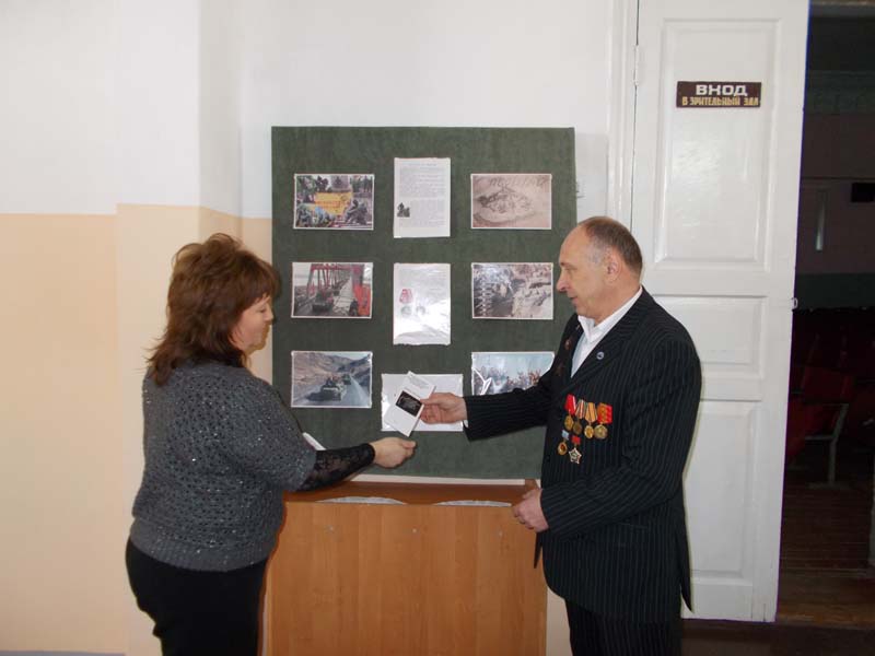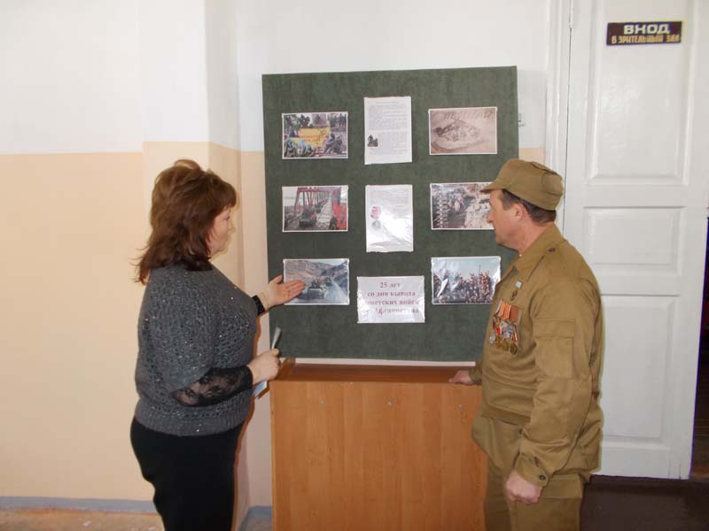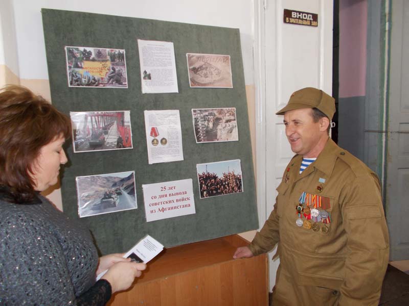 | К-р «Заря», МБУК «ОМЦБ». 13 февраля в кинотеатре «Заря» в честь 25-летия вывода советских войск из Афганистана, на торжественном собрании работники библиотеки провели информационную акцию у стенда «Уходили парни из Афгана». Цель :поздравление воинов - афганцев с годовщиной вывода последнего советского воина из Афганистана, патриотическое воспитание молодёжи. Для мероприятия был подготовлен информационный стенд и листовки, освещающие события 1979-1989 годов, когда ограниченный контингент Советских войск выполнял свой интернациональный долг в республике Афганистан. В мероприятии приняли участие 68 чел. | |