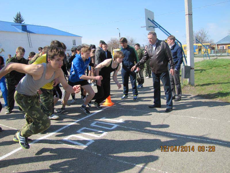 | В соответствии с планом работы отдела образования, 12 апреля 2014 года в МБОУ СОШ № 1 состоялась районная Спартакиада допризывной молодежи, в которой приняли участие юноши 10-11 классов средних школ района. Соревнования проводились по 5 видам: бег на 100 метров, бег на 1000 метров, подтягивание на перекладине, метание гранаты, неполная разборка и сборка АК. В личном зачете победителями и призерами соревнований стали: Бег на 100 метров 1 место, Хорин Илья, МБОУ СОШ № 11; 2 место, Пылев Евгений, МБОУ СОШ № 24; 3 место, Булко Максим, МАОУ СОШ № 9; 3 место, Гринев Иван, МБОУ СОШ № 8. Бег на 1000 метров: 1 место, Ивлев Владимир, МБОУ СОШ № 1; 2 место, Даниленко Даниил, МБОУ СОШ № 8; 3 место, Чивчан Владимир, МБОУ СОШ № 2. Подтягивание на перекладине: 1 место, Папенко Денис, МБОУ СОШ № 8; 2 место, Сиреканян Эрик, МБОУ СОШ № 16; 3 место, Окроян Семен, МБОУ СОШ № 16. Метание гранаты: 1 место, Тимошенко Александр, МБОУ СОШ № 6; 2 место, Козленко Александр, МБОУ СОШ № 17; 3 место, Косенко Олег, МБОУ СОШ № 59; 3 место, Пашаев Гаджиэскер, МБОУ СОШ № 28; 3 место, Булко Максим, МАОУ СОШ № 9. Неполная разборка и сборка АК: 1 место, Доронин Станислав, МБОУ СОШ № 8; 2 место, Восканян Артем, МБОУ СОШ № 16; 3 место, Энебишиев Баясхалан, МБОУ СОШ № 16. В командном зачете первое место разделили юноши школ № 8 и № 9, третье место заняла школа № 6. | |
