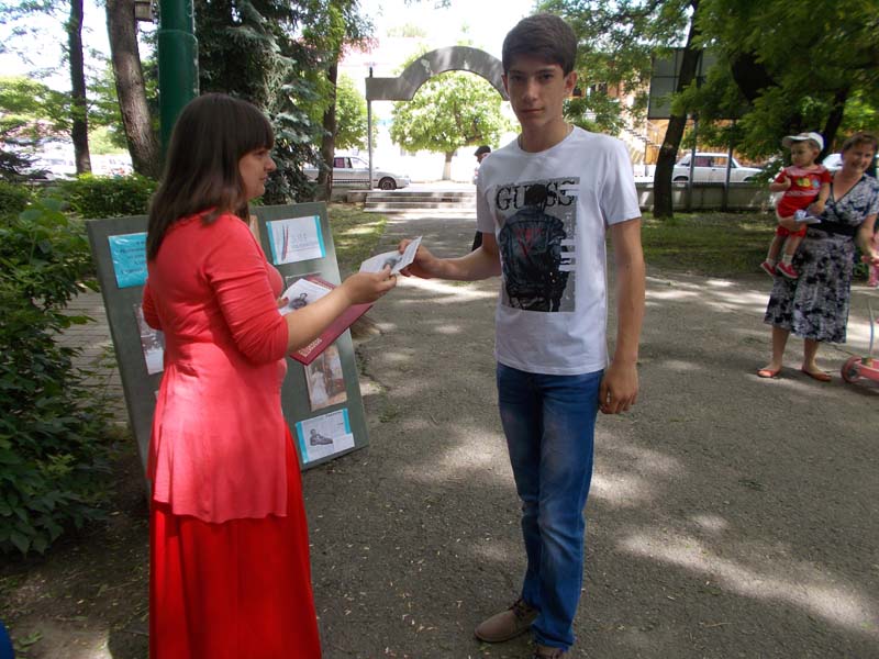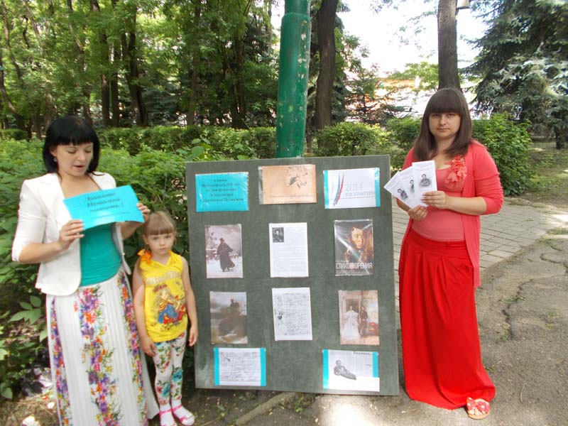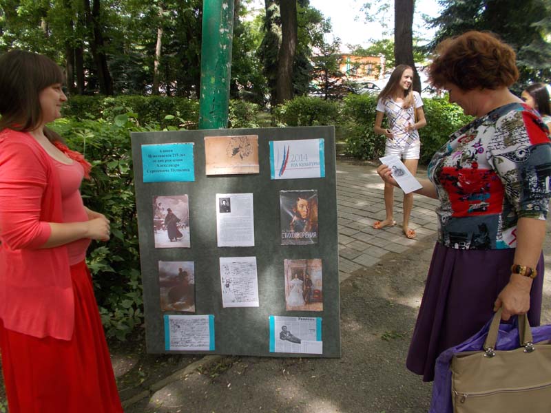 | (информационный калейдоскоп). 06.06.2014 г., 55 человек. 6 июня в России отмечается Пушкинский день. В этом году самому известному и любимому поэту нашей страны исполняется 215 лет со дня рождения . К этой знаменательной дате «Отрадненская межпоселенческая центральная библиотека» подготовила информационный калейдоскоп «Давайте Пушкина читать». В парке экспонировался стенд, информирующий посетителей о жизни и деятельности поэта, с его портретами, с копиями рукописей. Жителям и гостям станицы предлагалось продолжить известные стихотворения поэта, лучшие чтецы получали памятные призы. Раздавались информационные листовки « И сквозь века и поколенья он не устанет удивлять». Во время акции из репродукторов звучали стихотворения поэта в исполнении известных артистов. Цель мероприятия: пропаганда творчества А.С. Пушкина, воспитание чувства гордости за нашего знаменитого земляка, чувства патриотизма, причастности к истории и литературному наследию нашей Родины. | |
