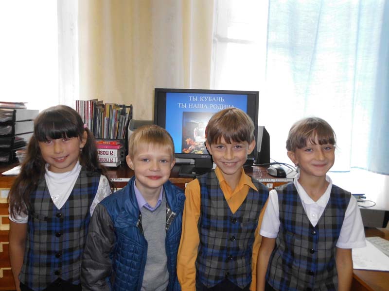 | (слайд-панорама). (01.10.2014. школа №1, 2-Б класс, 20 человек). «Кубань – казачий край» - электронная презентация прошла в РДБ 1.10.14. Цель презентации: помочь ребятам лучше осознать, на какой земле они живут и учатся, в чем прелесть края и быть достойными жителями своей малой родины. Авторы презентации постарались донести до ребят самое важное и известное на сегодняшний день о прошлом и настоящем Кубани. Рассказали о людях, какие они, что думали и думают о своей Земле. Ведь Кубань дала России немало ярких людей: государственных деятелей, ученых, писателей, просто замечательных тружеников. | |