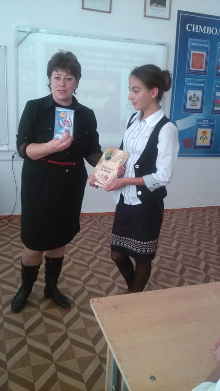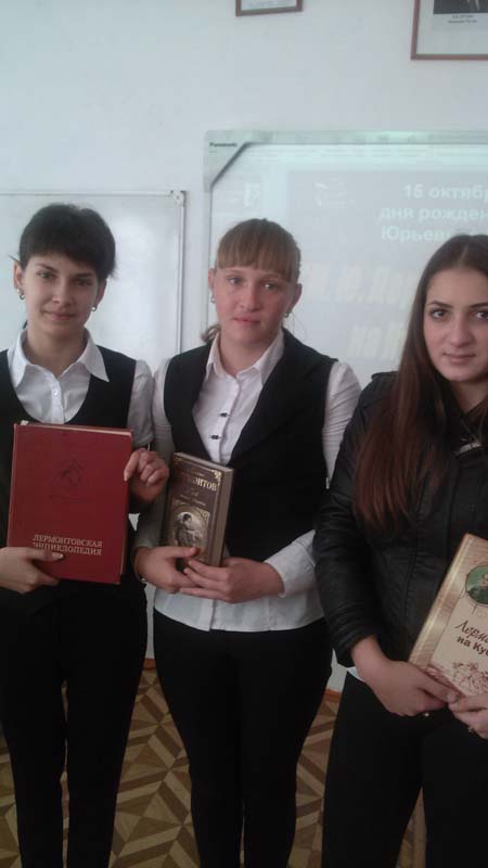 | 15 октября 2014 для учащихся старших классов МБОУСОШ №17 прошло мероприятие, приуроченное к 200-летию со дня рождения М.Ю.Лермонтова «Герой нашего времени -век XXI» - устный журнал (в рамках работы клуба «Собеседник». Цель мероприятия : пропаганда знаний о М.Ю. Лермонтове, патриотическое воспитание молодёжи на основе сведений о жизни и творчестве великого русского поэта. В основу мероприятия легла видео презентация «Лермонтов на Кубани». Ребятам рассказали о пребывании Лермонтова в 1837 и 1840 году на Кубани, они совершили виртуальную экскурсию в лермонтовский комплекс в Тамани. Во время мероприятия звучали стихотворения поэта, посвящённые Кавказу и Кубани. В ходе устного журнала библиотекарь вовлёк учащихся в дискуссию об актуальности творчества Лермонтова в наши дни. В заключении мероприятия ребятам было предложено на память прочесть стихотворение поэта. Справившимся с заданием вручались небольшие призы. На мероприятие присутствовали 43 человека. | |