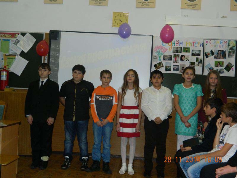 | 28 ноября 2014 года во всех школах района проведён Единый Всекубанский классный час «Мы будем вечно прославлять ту женщину, чьё имя - Мать!». В мероприятиях приняло участие 3848 мам, 5628 школьников и 283 педагога. В течение ноября школьники участвовали в конкурсах сочинений и стихов о маме. В школах были оформлены выставки детских поделок и открыток для мам. | |