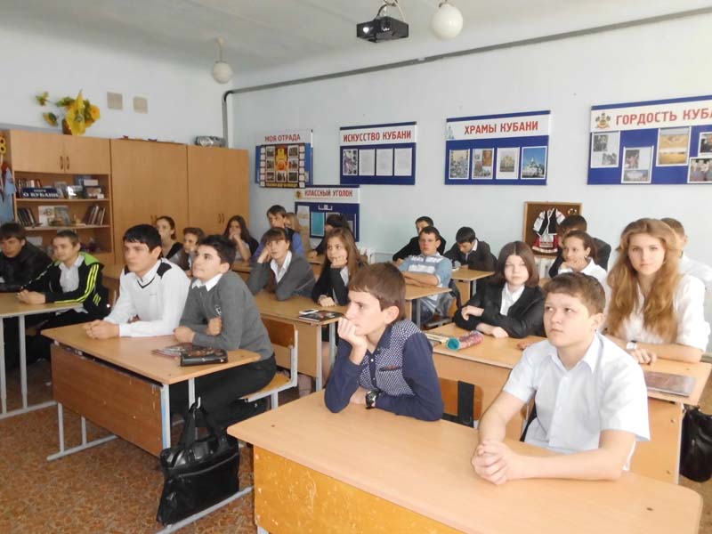 | (Устный журнал). 02.04.2015- МБОУСОШ №1, 8-а, 8-б, 8 –в, 61 человек. Работники районной детской библиотеки провели мероприятие для учащихся старших классов МБОУСОШ №1. Устный журнал был посвящен молодежному имиджевому календарю 2015года, изданного Краснодарской краевой юношеской библиотекой имени И. Ф. Вараввы. Восьмиклассники узнали, что героями календаря стали 12 юных кубанцев, которые уже успели заявить о себе в поэзии, прозе, журналистики. Они все очень разные, но очень одаренные и трудолюбивые. Многие из них уже имеют авторские сборники. Ребятам отрадно было слышать, что среди них наш земляк из станицы Удобной - Олег Ниминущий. На мероприятии прозвучали стихотворения юных дарований. | |