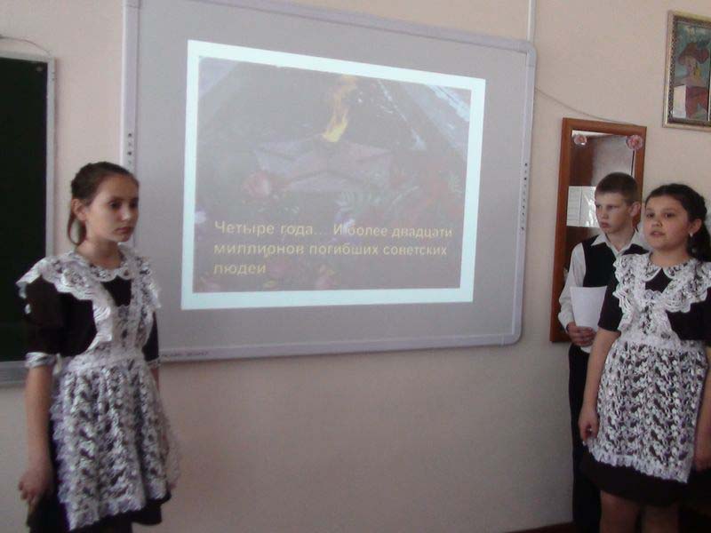 | В школах района с 13 по 20 апреля 2015 годаво всех классахпроведены уроки, посвященные 70-летию Победы в Великой Отечественной войне. Цель проведения уроков - раскрытие подвига советского народа в годы Великой Отечественной войны, развитие чувства патриотизма, гордости подвигами земляков. Темы уроков: «Дети и война» (1-5 классы), «Юность опаленная войной» (6 классы), «Цена войны» (7 классы), «Вечная память героям» (8-9 классы), «Партизанское движение в годы Великой Отечественной Войны» (10-11 классы). При проведении Уроков Победы использованы материалы школьной и районной детской библиотек, сайта ФГАОУ «Академия повышения квалификации и профессиональной переподготовки работников образования», презентации учителей и учащихся, фрагменты художественных и документальных фильмов о Великой Отечественной войне. На каждом уроке использовался культурно-образовательный потенциал музеев и библиотек, домов культуры.Учащиеся 3-6 классов посетили музей в ст. Бесстрашной и на уроке поделились своими впечатлениями. Учащиеся 8-9-х классов на урок принесли поделки, связанные с темой урока «Вечная память героям». 10-11-е классы нашли в библиотеках материал о партизанском движении в годы Великой Отечественной Войны. | |