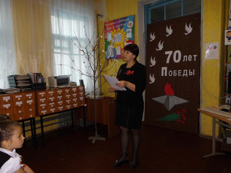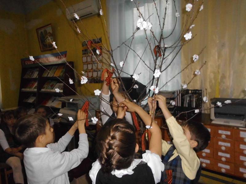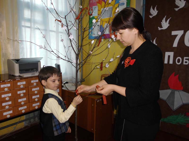 | (час – истории). 29.04.2015., РДБ, МБОУСОШ №1, 2 – В класс, 16 человек. 29 апреля в районной детской библиотеке прошел час истории, посвященый Победе нашего народа в Великой Отечественной войне. Поскольку новое поколение мало знает о событиях Великой Отечественной войны, задача состояла в том, чтобы эмоционально и образно рассказать учащимся о тех грозных боевых годах, вызвать у них интерес к своей истории, умение противостоять вражеским интервенциям о роли нашего народа в Великой Отечественной войне, воспитать стойкую гражданскую позицию. В конце мероприятия ребята повязали Георгиевскую ленту на дерево Памяти. | |