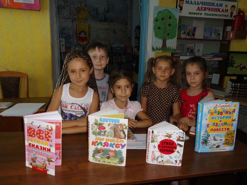 | (библиотечный урок). 12.08.2015.г. детский сад № 2, 16 человек. Районной детской библиотекой проведено мероприятие «Твой любимый писатель, художник», о Владимире Григорьевиче Сутееве. Сутеев В.Г. - один из зачинателей советской мультипликации. Детский писатель, художник-иллюстратор и режиссёр-мультипликатор. В ходе мероприятия ребятам из детского сада № 2 предложили познакомиться с биографией писателя, художника В.Г. Сутеева, показали презентацию с иллюстрациями, показали мультфильмы, а также предоставили возможность поучаствовать в игре, где были использованы вопросы, составленные на основе произведений В.Г. Сутеева. | |