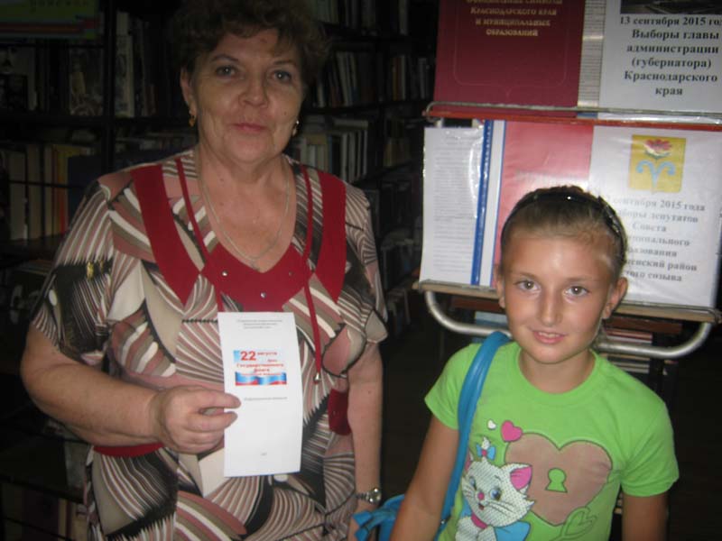 | (информационная акция). 21.08.2015г. МБУК «ОМЦБ», центральный парк. 21 чел. Библиотекари МБУК»ОМЦБ» для жителей и гостей станицы Отрадной провели информационную акцию, приуроченную ко Дню Российского флага. Цель: патриотическое просвещение население, пропаганда праздника. Участники мероприятия получили информационные листовки, повествующие о истории и традициях празднования Дня Российского флага. | |