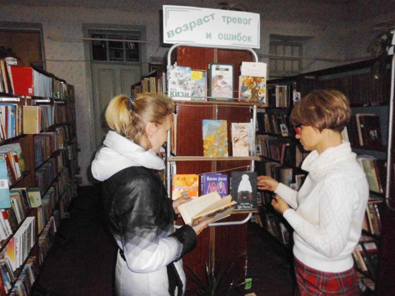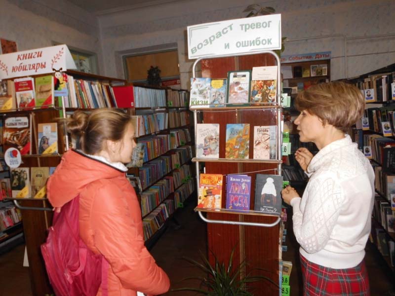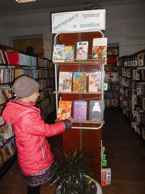 | (Беседа - обзор у книжной выставки). 18.11.2015г., РДБ, 15 человек. В течение дня в рамках программы «Год литературы» в районной детской библиотеке проходила беседа - обзор у книжной выставки «Возраст тревог и ошибок». Ребята познакомились с произведениями современных авторов, герои которых оказываются в сложных жизненных ситуациях. Часто взрослые считают проблемы подрастающих детей наивными и не могут, не хотят помочь. Где найти добрый совет, к кому обратиться? Вот они, хорошие друзья, верные помощники, - книги. | |