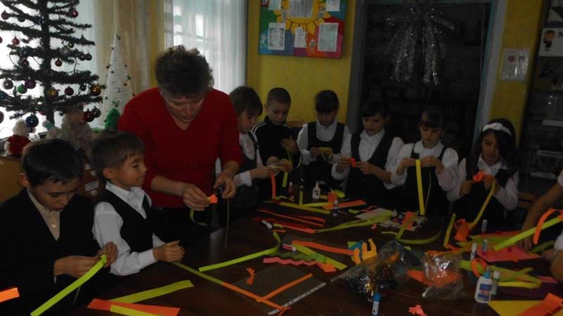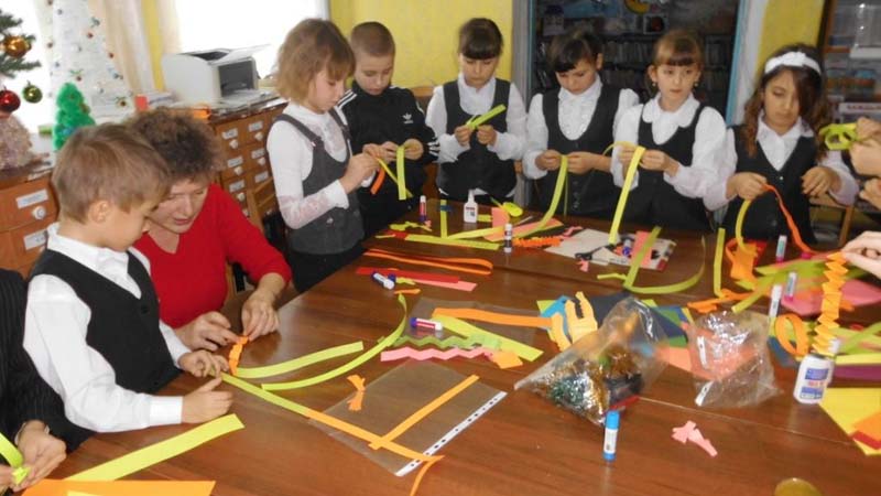 | (Урок творчества.) 22.12.15.г, 3-А класс, школа №1, 26 человек. «Новогодняя мастерская» - под таким названием прошёл творческий урок для учащихся третьих классов в районной детской библиотеке. Символ наступающего Нового года - обезьяна. На мероприятии дети под руководством библиотекаря сделали поделку - обезьянку на ёлку, из полосок цветной бумаги. Целью мероприятия было развитие творческих способностей и фантазии у детей. | |