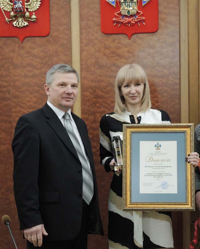 В декабре 2015 года прошел конкурс «Лучшее предприятие оптовой торговли Краснодарского края 2015 года». Этот конкурс позволяет подвести итоги работы предприятий оптовой торговли края за 2015 год и отметить тех, кто добился определенных успехов в своей деятельности. В этом году конкурсанты боролись за звание лучших в 4 специальных, 1 персональной и 2 основных номинациях. В конкурсе приняли участие 48 предприятий оптовой торговли, представляющие 22 муниципальных образований края. Конкурсанты оценивались по 15 критериям показателей финансово-хозяйственной деятельности организаций. По итогам конкурса 22 декабря 2015 в городе Краснодаре в здании администрации края была проведена торжественная церемония награждения победителей конкурса. Среди конкурсантов в специальной номинации «Лучший поставщик товаров, функционирующий в сельской местности» победителем признана индивидуальный предприниматель Иванова Лилия Владимировна, Отрадненский район.» | |