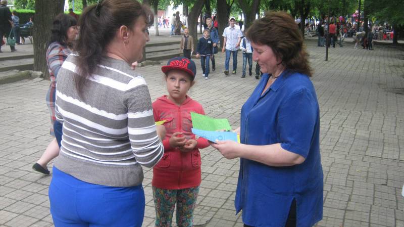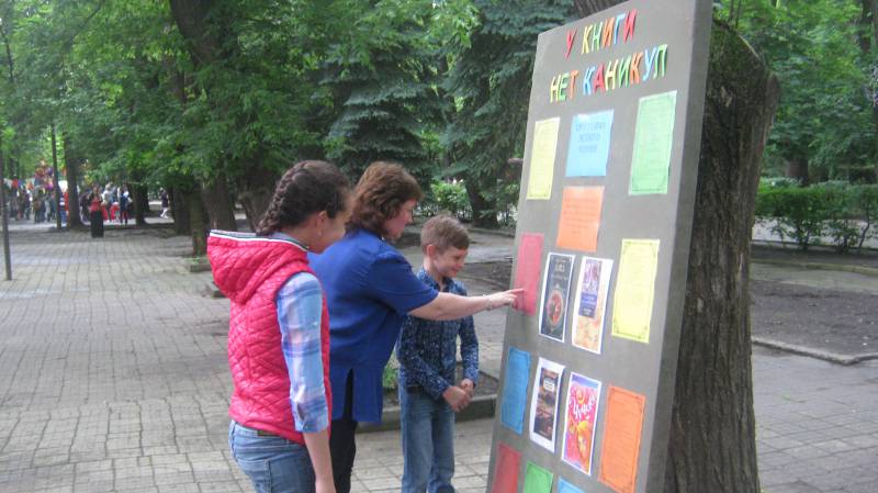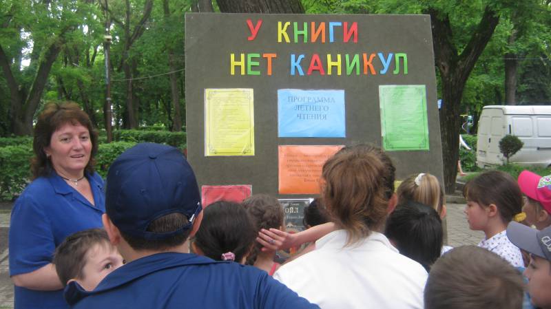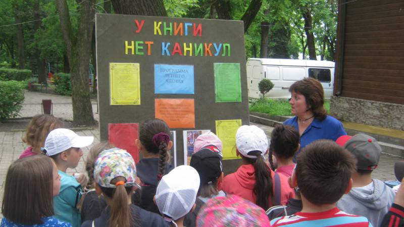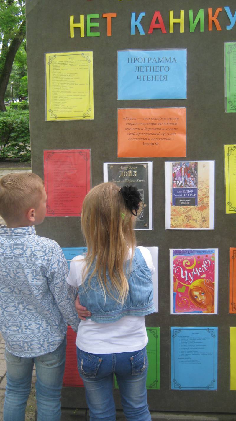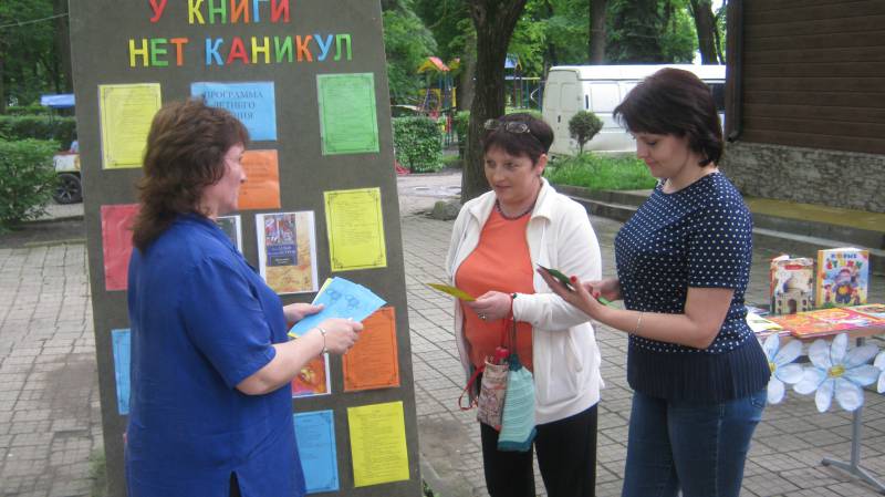 | (Акция у информационного стенда) 01.06.2016. 53 человека. Центральный парк. 1 июня в Международный день защиты детей. Библиотекари «Отрадненской межпоселенческой центральной библиотеки» приняли активное участие в районном мероприятии, посвященному данному празднику. В центральном парке экспонировался стенд под названием «У книги нет каникул», у которого библиотекари провели обзоры летнего чтения для ребят разных возрастов. Родители пришедшие на районный праздник «День защиты детей» получили памятки с информацией о необходимости соблюдать «Детский закон» (Закон Краснодарского края № 1539-КЗ от 21 июля 2008 года «О мерах по профилактике безнадзорности и правонарушений несовершеннолетних в Краснодарском крае») и в дни летних каникул. | |