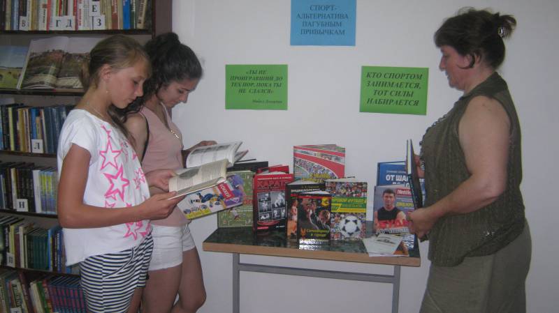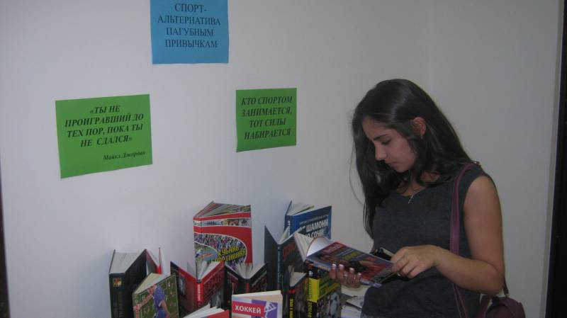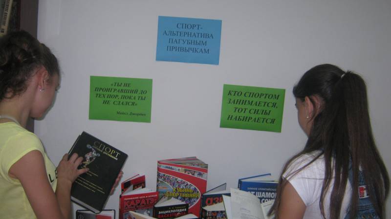 | Книжная инсталляция. 6.07.16., 16 человек. Абонемент центральной библиотеки. Цель: пропаганда библиотеки, привлечение к чтению и здоровому образу жизни, борьба с асоциальными явлениями. У книжной инсталляции библиотекари центральной библиотеки провели обзор литературы о спорте, рассказали посетителям о тех видах спорта, которые могут легко войти в привычку человека и заменить любые пагубные привычки. Так же в ходе мероприятия на компьютере демонстрировался видеоролик «О спорте», (12+). | |