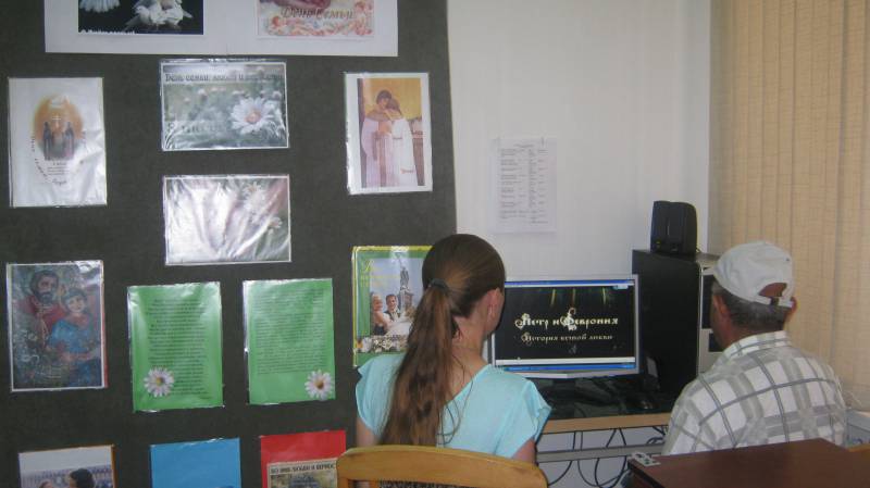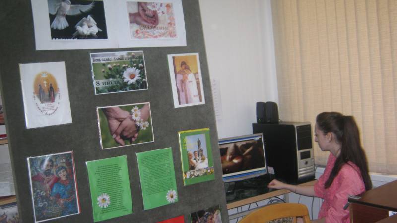 | Говорящая книжная выставка к Всероссийскому Дню семьи, любви и верности. 8.7.2016., отдел обслуживания. 15 человек. Цель: пропаганда культурно-нравственного просвещения, популяризация семьи и семейных ценностей у подрастающего поколения. В этот день Отрадненская районная библиотека провела мероприятие, посвященное Всероссийскому дню семьи, любви и верности. Все читатели, посетившие библиотеку, ознакомились с историей необыкновенной любви Петра и Февронии, ставших образцами супружеской верности, взаимной любви и семейного счастья ещё при жизни, об истории самого праздника, ставшего праздником всероссийского масштаба. Мероприятие сопровождалось демонстрацией документального кинофильма «Петр и Феврония. История вечной любви». | |