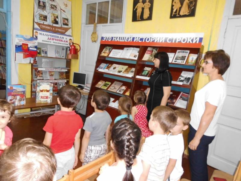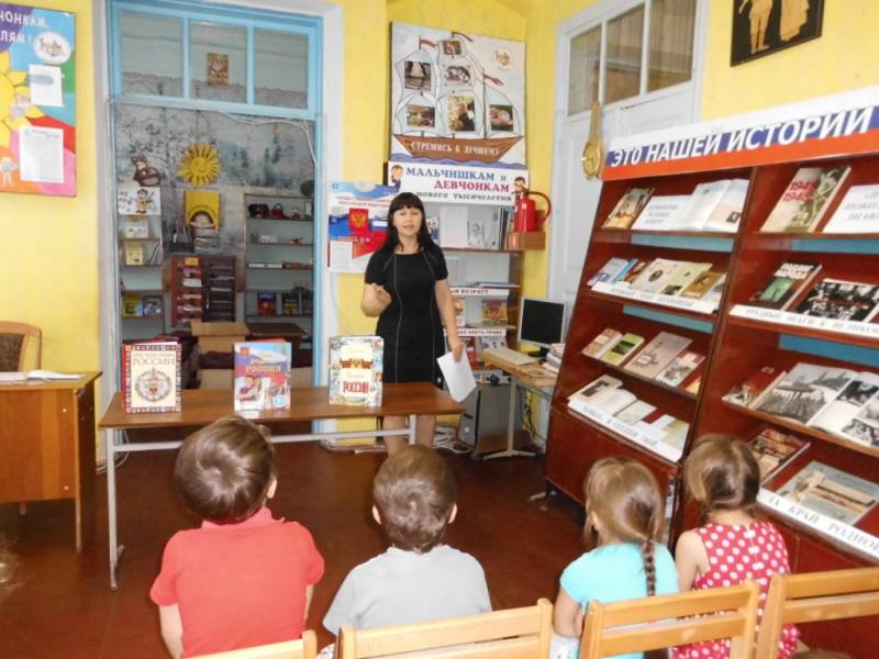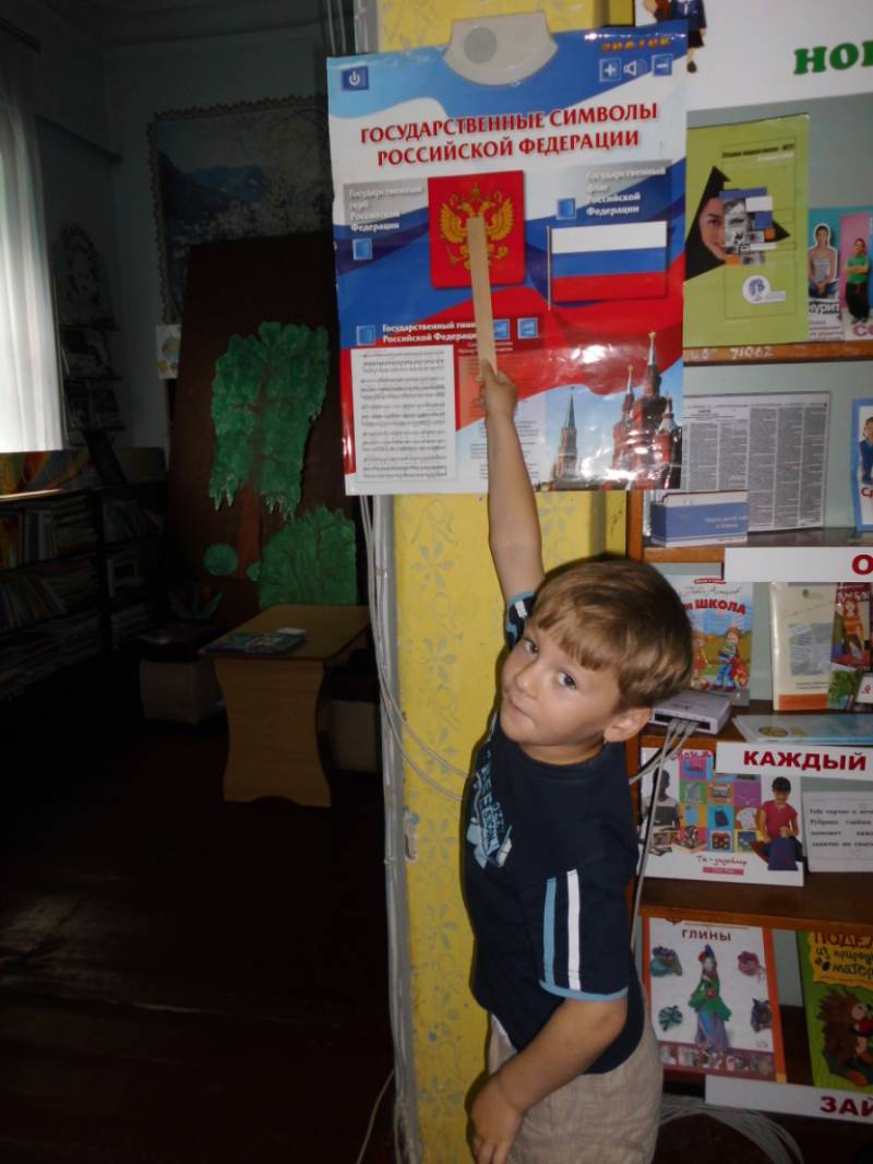 | 22.08.2016г.- МБДОУ №5, 11 человек. 22 августа в районной детской библиотеке прошло виртуальное путешествие «Наш дом Россия», приуроченное к Дню государственного флага России. Ребята просмотрели презентацию о нашей Родине, узнали о главных символах России: гербе, флаге, гимне. Поговорили о трудной, но почетной обязанности защищать Родину, охранять её спокойствие, о храбрости наших прадедов и дедов. Приняли участие в викторине на знание символов нашей Родине. | |