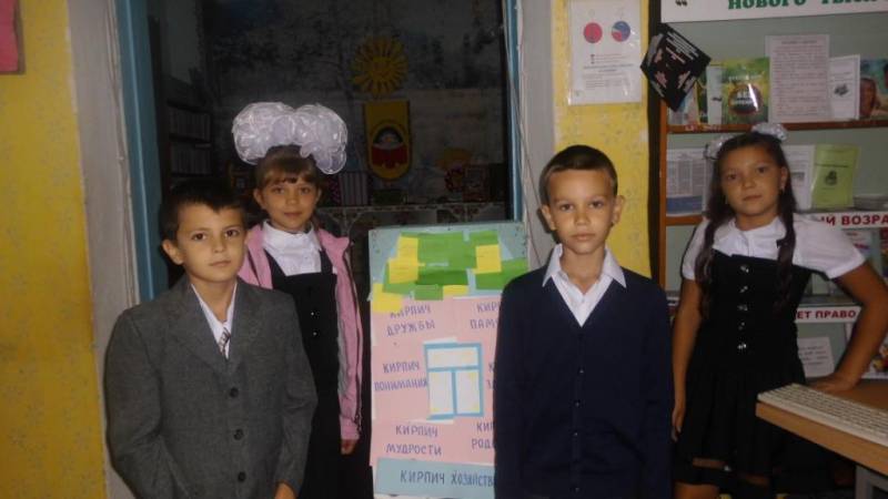 | (Цикл мероприятий к Дню знаний.) 01.09.2016года, 70 человек. 1 сентября библиотекари районной детской библиотеки в стенах МБОУСОШ № 1 им. Колесника А.С. для учащихся 9 –го класса провели всекубанский классный час «Имя Кубани». Библиотекари постарались донести до ребят самое важное и известное о прошлом и настоящем Кубани. Рассказали о людях, которыми гордится Кубань, имена которых вписаны золотыми буквами в историю Кубани. Ведь Кубань дала России немало ярких людей: государственных деятелей, ученых, писателей, просто замечательных тружеников. Также в этот день гостями районной детской библиотеки стали ученики 3 класса МБОУСОШ № 1 им. Колесника А.С. Мероприятие посвящено всекубанскому классному часу «Имя Кубани». На игровом мероприятии «Кубань – наш общий дом» библиотекари говорили о любви к малой Родине, о ее истории и замечательных людях, проживающих в нашем крае. Ребята вместе с библиотекарем строили общий дом, поочередно укладывая кирпичики в его стены. А кирпичики у нас необыкновенные: Кирпич Мудрости Кирпич Дружбы Кирпич Хозяйственности Кирпич Понимания Кирпич родства Кирпич Здоровья Кирпич Памяти А завершили строительство дома «крышей добрых дел» (каждый ребенок рассказал, какое доброе дело он хочет сделать в будущем для своей малой родины). Перед зданием детской библиотеки были оформлены: стенд - «Дети Отрадной читают», и книжная выставка - инсталляция - «Школа – это здорово», где для читателей представлены книги, журналы, рекламная продукция библиотеки. Все желающие могли принять участие в разгадывании «Школьного кроссворда». | |
