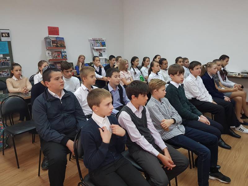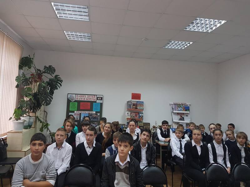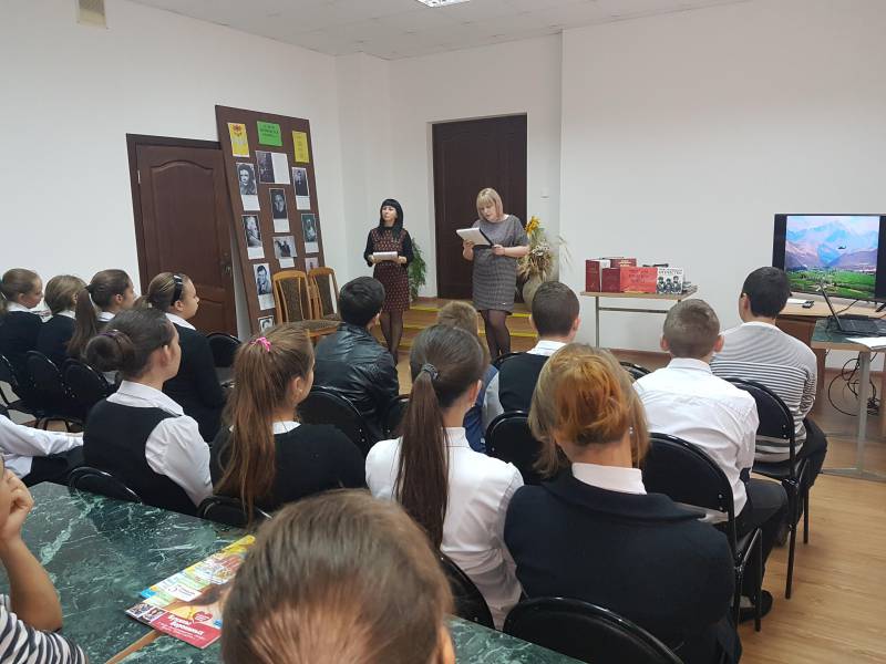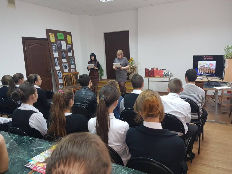 | МБУК «ОМЦБ». 10.10.2016, 57 человек. 10 октября 2016 года в «Отрадненской межпоселенческой центральной библиотеке» состоялся не запланированный урок мужества - «Живая память». Гостями библиотеки в это день стали ученики 7-х классов МБОУСОШ № 1 им. А. С. Колесника и МАОУСОШ № 9. Афганская война... Как много, и мало мы о ней знаем. Она ушла в историю и за неполных десять лет унесла многие тысячи жизней воинов-интернационалистов. Целью данного урока стало: воспитание патриотизма, любви к Родине; активизация интереса к углублённому изучению истории Отечества; сохранение и развитие у учащихся чувства гордости уважения к подвигу своих предков; формирование у школьников готовности к вооружённой защите Родины; повышение интереса учащихся к военно-прикладным видам спорта, развитию физических и волевых качеств; формирование готовности учащихся к действиям в экстремальных ситуациях; развитию кругозора, ответственности за будущее. Ребята более подробно познакомились с событиями афганской войны 1979-1989 гг.; просмотрели электронную презентацию. На фоне общих сведений об Афганистане, подробно было рассказано о службе в Афганистане четверых воинов – интернационалистов из Отрадненского района: Аулове Сергее Владимировиче, Зайцеве Сергее Ивановиче, Пискунове Сергее Николаевиче, Жаркове Геннадии Анатольевиче, которые героически погибли в Афганской войне. Так же были продемонстрированы видеоролики на песни афганской тематики: «Афганистан» (Пришел приказ), «Опять тревога»..., Мишель «Зажгите свечи». По окончанию мероприятия ребята пообещали библиотекарям составить отзывы об уроке и передать их в библиотеку. | |