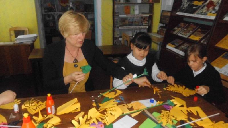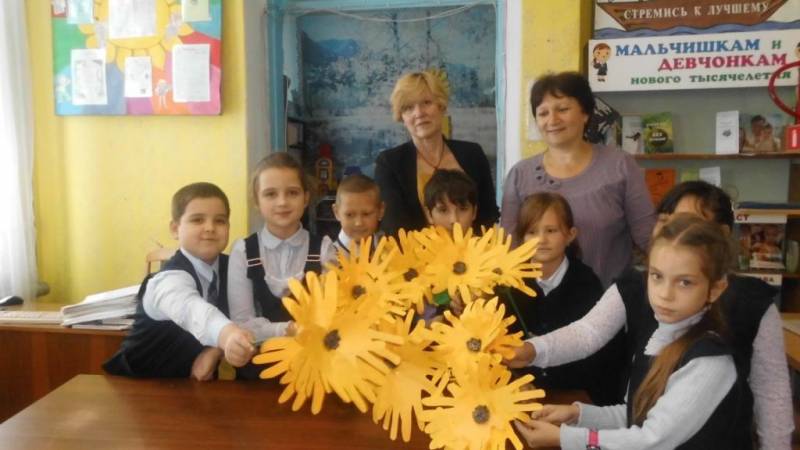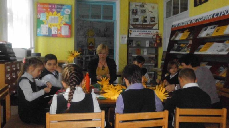 | (Мастерская поделок) 19.10.2016г., РДБ, МБОУСОШ № 1 школа, 2класс, 10 человек. Цель данного мероприятия - сплотить ребят, ведь веселое, интересное занятие сближает и пробуждает фантазию и творчество. На заседании клуба ребята сделали подсолнух из цветной бумаги, картона, гофрированной бумаги. Шаблоном для лепестков стали ладошки ребят. Дети получили огромное удовольствие в процессе творчества. | |