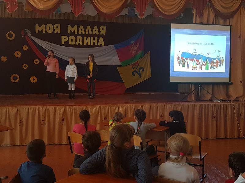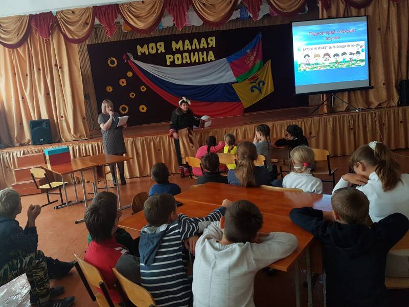 | Где и когда бы мы с вами не находились, нас всегда окружают люди разных национальностей. Ведь не случайно Конституция нашей страны начинается со слов: «Мы, многонациональный народ Российской Федерации, соединенный общей судьбой на своей земле...». 4 ноября 2016 года в День народного единства работники «Отрадненской межпоселенческой центральной библиотеки» отправились в гости к ученикам начальной школы МАОУСОШ № 9. В ходе мероприятия дети познакомились с историей возникновения праздника, подвигами наших предков во имя независимости Родины. Ребята узнали, сколько разных народов проживает в России, в Краснодарском крае, в Отрадненском районе. Поздравительные телеграммы ребятам в честь праздника прислали русские, татарские, армянские школьники, но случилорсь не придведенное, обстоятельство по пути телеграммы перехватила Баба Яга… Чтобы получить поздравления обратно детям пришлось открыть секрет волшебного ящика, ответить на вопросы викторины, станцевать веселый танец, исполнить гимн российской федерации, прочесть стихи. В конце концов, Баба Яга раскаялась, вернула подарки, в которых оказались сказки разных народов мира. По окончании мероприятия, все ребята получили сладкие призы. | |