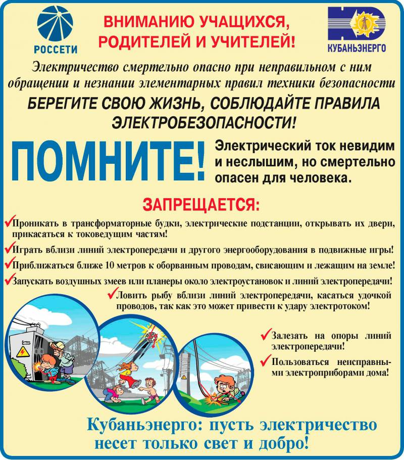 Дата публикации: 12 апреля 2017 ![]() Филиал ПАО«Кубаньэнерго» Армавирские электрические сети обращается к родителям, учителям и воспитателям детских учреждений с настоятельной просьбой рассказать детям о смертельной опасности электрического тока при несоблюдении правил поведения вблизи энергообъектов. Сегодня без электроэнергии немыслима жизнь современного человека. Электричество – наш верный помощник в труде и в быту, но оно становится опасным для жизни человека, если с ним неправильно и небрежно обращаться. Для того, чтобы обезопасить детей от нежелательного воздействия электрического тока, мы взрослые, обязаны постоянно обучать детей основам безопасности жизнедеятельности. Ведь так СТРАШНО, когда причиной трагической случайности становятся пять минут, которые мы не уделили нашим детям. Детская психика устроена удивительным образом: боясь тени под кроватью, ребенок может спокойно залезть на крышу трансформаторной будки или схватиться за провод. Непонимание детьми опасности электрического тока может привести к трагедии. РАССКАЖИТЕ ДЕТЯМ И ПОДРОСТКАМ, ЧТО СМЕРТЕЛЬНО ОПАСНО: - ВЛЕЗАТЬ на опоры воздушных линий, крыши домов и строений, где по близости проходят электрические провода. - САМОВОЛЬНО ПРОНИКАТЬ на территорию энергообъектов, открывать дверцы распределительных щитов, трансформаторных будок, имеющих предупредительные знаки, такие как желтый треугольник с молнией и «Стой! Напряжение»; Важно знать, что попасть под напряжение можно и не касаясь токоведущих частей, а только приблизившись к ним на недопустимое расстояние. В воздушном промежутке между электроустановкой и телом человека может возникнуть электрическая дуга (своеобразная молния), которая нанесет несовместимые с жизнью травмы; - НАБРАСЫВАТЬ на провода ВЛ проволоку, веревки и другие предметы, так как это может привести к обрыву и схлестыванию проводов, короткому замыканию; - ПРИБЛИЖАТЬСЯ к оборванным проводам, лежащим на земле, ближе чем на 8 метров, и тем более прикасаться к ним. Получить удар током можно и в нескольких метрах от провода за счет шагового напряжения; - Смертельно опасно ИГРАТЬ под высоковольтными линиями электропередачи и вблизи трансформаторных подстанций, нельзя запускать под проводами воздушных змеев, разбивать изоляторы на опорах. - Летом, находясь в походе, либо идя на рыбалку, опасно останавливаться на отдых вблизи воздушных линий электропередачи и подстанций, разводить костры, РЫБАЧИТЬ под проводами линии электропередачи. С самого раннего возраста дети должны знать элементарные ПРАВИЛА ЭЛЕКТРОБЕЗОПАСНОСТИ В БЫТУ. НЕЛЬЗЯ вставлять в розетку посторонние предметы. Выключая электроприбор, НЕЛЬЗЯ тянуть за шнур. Он может оборваться. Надо взяться за штепсель и плавно вынуть его из розетки. НЕЛЬЗЯ включать в одну розетку сразу много электроприборов. Не оставляйте включенные электроприборы без присмотра! Оставленные без присмотра электроприборы часто становятся причиной ПОЖАРА. НЕЛЬЗЯ пользоваться неисправными электроприборами. Если от электроприбора пахнет горелой резиной, если видны искры – надо немедленно отключить его от сети и рассказать об этом взрослым. ПОМНИТЬ, что электричество не терпит соседства с водой. Чтобы не получить удар током, НЕЛЬЗЯ касаться включенных электроприборов мокрыми руками, протирать электр