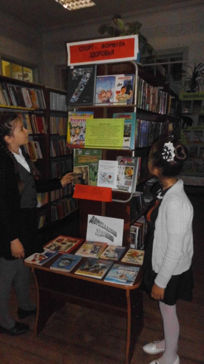 | (Выставка беседа) 05.05.2017г., 15 человек. В рамках программы районной детской библиотеки по пропаганде здорового образа жизни «Будь здоров!» библиотекари провели беседу у выставки «Спорт- формула здоровья». Во время беседы библиотекари рассказывали ребятам о книгах, представленных на выставке, которые способствуют формированию здорового образа жизни. | |