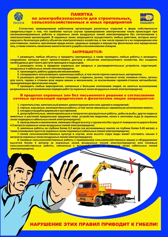 Энергетики Армавирского филиала ПАО«Кубаньэнерго» (входит в группу Россети) обращаются к руководителям всех организаций, землепользователям и гражданам района и напоминают о запрете производства любых видов работ в охранных зонах линий электропередачи без согласования с электросетевой компанией. Несанкционированные работы в охранных зонах могут стать причиной поражения людей электрическим током, повреждения энергообъектов. Для обеспечения безопасности населения, сохранности электрических сетей и предотвращения несчастных случаев в охранных зонах ВЛ и вблизи подстанций запрещены: погрузо-разгрузочные работы, строительство и реконструкция зданий и сооружений, сельскохозяйственные и строительные работы с использованием крупногабаритной техники, валка и обрезка деревьев, проведение земляных работ в местах прохождения кабельных линий. Охранная зона ЛЭП – это место повышенной опасности. Приближение на недопустимое расстояние к линии электропередачи, находящейся под напряжением, может не только повлечь нарушение энергоснабжения потребителей, но и представляет смертельную опасность для тех, кто работает рядом с ЛЭП или случайно оказался рядом. – Для получения разрешения на осуществление работ в пределах охранной зоны необходимо обратиться с письменным заявлением в электросетевую компанию не позднее, чем за 15 дней до осуществления работ, – поясняет директор Армавирских электрических сетей Рустам Магдеев. Должностные лица и граждане, виновные в нарушении охранных зон, могут понести как административную, так и уголовную ответственность – в случае, если нанесен значительный материальный ущерб, либо ущерб жизни и здоровью человека. В охранных зонах ЛЭП запрещается: - размещать детские и спортивные площадки, стадионы, рынки, торговые точки, полевые станы, загоны для скота, гаражи и стоянки всех видов машин и механизмов; - проводить любые мероприятия, связанные с большим скоплением людей; - размещать АЗС, хранилища горюче-смазочных материалов, устраивать свалки, склады, разводить огонь; - возводить любые сооружения, которые могут препятствовать доступу к объектам электросетевого хозяйства и проведению ремонтно-эксплуатационных работ. Энергетики систематически выявляют факты нарушений охранных зон ЛЭП на территории энергорайона, регулярно направляют предупреждения нарушителям, главам местных самоуправлений и в прокуратуру с обозначением границ охранных зон ВЛ. В местах перехода воздушных линий через реки и водоемы во избежание случаев электротравматизма энергетики устанавливают щиты и знаки безопасности, запрещающие ловить рыбу под проводами. Рыбакам необходимо быть внимательными также и при перемещениях под линиями электропередач. Чтобы не допустить случайного прикосновения к проводам или приближения удочки на недопустимо близкое расстояние, необходимо предварительно складывать удилища (которые изготавливаются в большинстве случаев из токопроводящих материалов), и нести его параллельно земле. Справка: согласно действующему законодательству, для воздушных линий электропередачи напряжением 0,4 кВ охранная зона составляет 2 метра, для ВЛ 6/10 кВ – 10 метров, для ВЛ 35 кВ — 15 метров, а для 110 кВ — по 20 метров в обе стороны от крайних проводов линии. Сообщить информацию о фактах повреждения или обрыва воз
