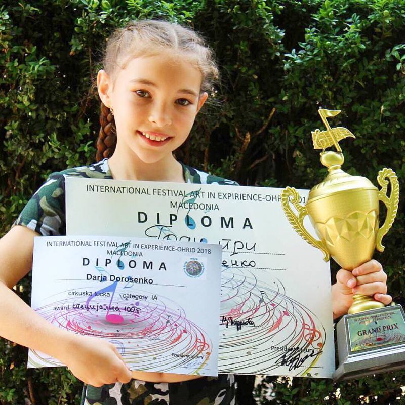 Набравшая наивысшее количество баллов за номера «Спецназ» и «Под дождём», участница фестиваля Дарья Дорошенко - воспитанница образцовой художественной цирковой студии «Грация» районного Дома культуры станицы Отрадной, под руководством Татьяны Владимировны Часнык. Жюри единогласно присудили ей диплом и кубок победителя GRAND-PRIX "International Festival "Art In Experience" - 2018", Ohrid (Macedonia) г. Охрид республика Македония, в номинации "Цирковое искусство". Поздравляем юную цирковую артистку с победой и покорением новой вершины!