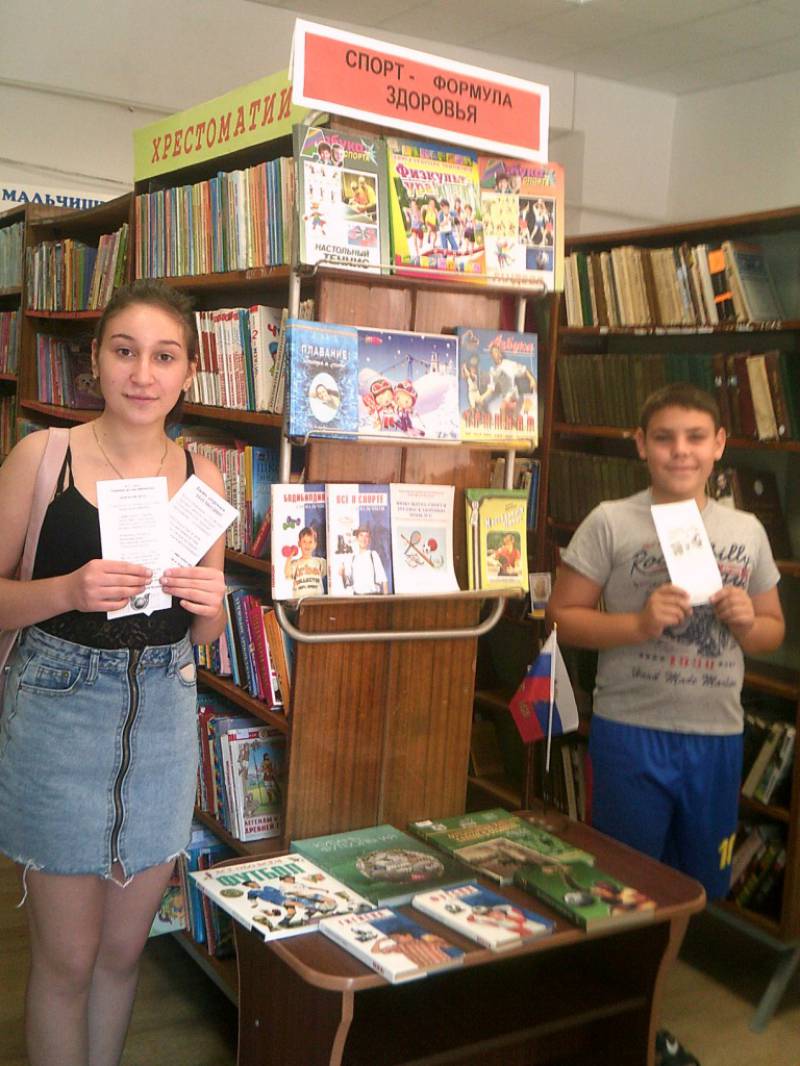 | В рамках программы популяризации здорового образа жизни «Будь здоров!» в РДБ библиотекари провели информационную акцию «Выбирай спорт! Выбирай здоровье!» 19 июля в течение дня библиотекари районной детской библиотеки раздавали информационные листовки и беседовали с ребятами о спорте, который формирует здоровое тело и дух, способствует увеличению выносливости и физической силы. Спорт учит быть ответственными. Спортивные тренировки формируют лидерские качества, помогают взаимодействовать в коллективе, где-то уступать, где-то настаивать на своем, подчиняться правилам и нормам. А самое главное спорт - это залог крепкого здоровья. | |