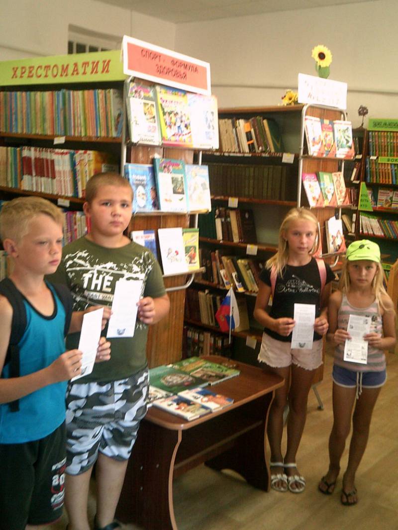 | Здоровье детей - это политика, в которой заложено наше будущее, поэтому перед педагогами, родителями и общественностью стоит задача воспитания здорового поколения. Почти все, что человек делает изо дня в день, можно считать привычками. Вредные привычки появляются легко, а хорошие можно в себе воспитывать, и это требует усилий. Такие вредные привычки, как долгое жевание жевательной резинки приводит к заболеваниям ЖКТ, чрезмерное увлечение компьютерными играми к нарушению осанки и зрения и т.д. Особое беспокойство вызывают проблемы табакокурения, алкоголизма и наркомании. Сегодня они – бич времени, угрожающие здоровью нации. Библиотеки муниципального образования Отрадненский район непрерывно проводят работу, направленную на формирование здорового образа жизни, полезных привычек способствующих укреплению здоровья человека. 7 августа библиотекари районной детской библиотеки провели информационную акцию «Говорим НЕТ вредным привычкам». Библиотекари постарались донести до ребят важные правила здорового образа жизни: соблюдение режима дня, закаливание организма, занятие спортом. Ребята пообещали стараться всегда быть здоровыми, активными и жизнерадостными. Каждый участник акции получил листовку. В мероприятии участвовало 21 человек. | |