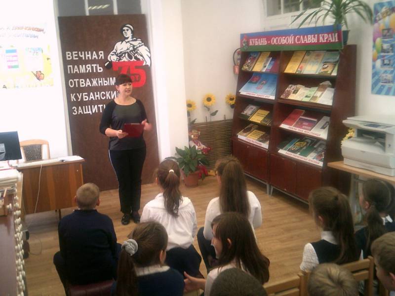 | 24 октября библиотекари районной детской библиотеки для учащихся 4 класса МБОУСОШ №1 имени Колесника А.С. провели час истории «Как освобождали Кубань». Мероприятие посвящено 75-летию освобождения Отрадненского района и Краснодарского края от немецко - фашистских захватчиков. Ребята из рассказа библиотекаря узнали, когда и как началось освобождение района и Кубани. Дети познакомились с историческими фактами о времени оккупации Краснодарского края, узнали о зверствах, чинимых фашистами на нашей земле, статистических данных о потерях и трудностях восстановления края. Большой интерес вызвала электронная презентация «Помним подвиг земляков» о героях Лавриненко Дмитрии Федоровиче и Степане Кацура. В мероприятии приняли участие 15 человек. | |