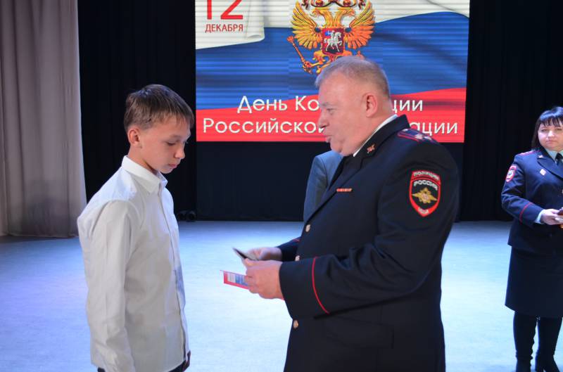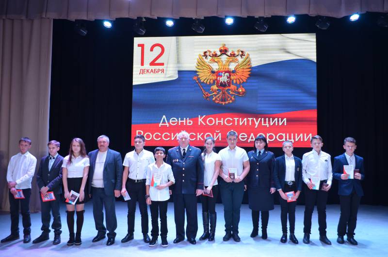 | 12 декабря 2018 года в районном Доме культуры состоялось торжественное вручение паспортов в рамках Всероссийской акции «Мы-граждане России». В торжественной обстановке из рук заместителя главы муниципального образования Отрадненский район Ванюкова Владимира Геннадьевича, начальника отдела МВД России по Отрадненскому району, полковника полиции Рассохина Виктора Аркадьевича, начальника отдела по вопросам миграции отдела МВД России по Отрадненскому району Ковальчук Натальи Владимировны 10 юных жителей нашего района получили свой основной документ, удостоверяющий личность - паспорт гражданина Российской Федерации. | |