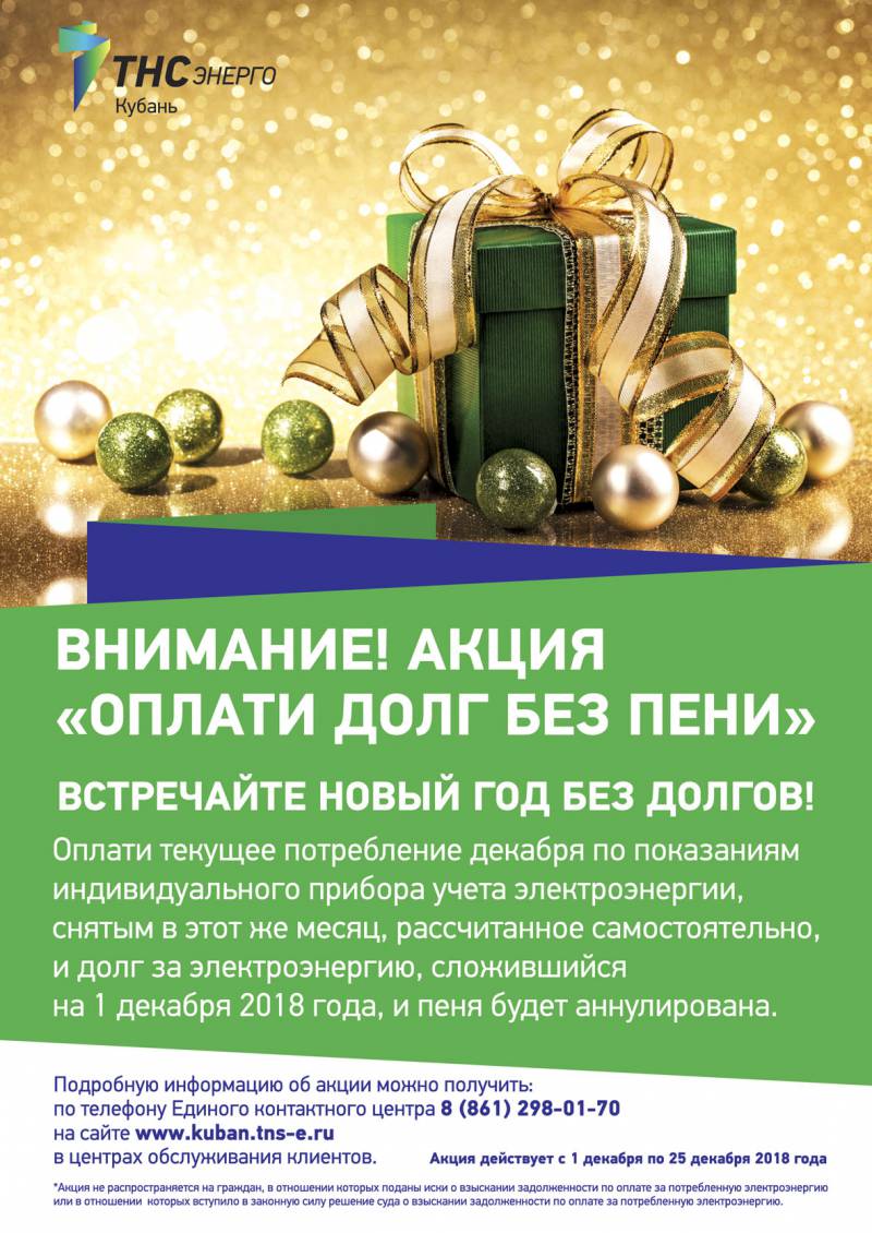 ПАО «ТНС энерго Кубань» объявляет о старте акции «Оплати долг без пени» |