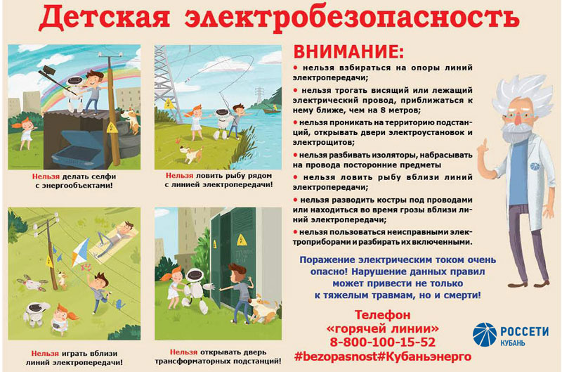 Дата публикации: 7 ноября 2019 ![]() Специалисты Армавирского филиала «Россети Кубань» призывает родителей и учителей напомнить детям правила электробезопасности! Еще раз проговорите с детьми правила безопасности, которые должен знать каждый ребенок: чем опасно электричество в быту, и чем могут закончиться невинные с виду игры возле энергообъектов. Привить детям культуру безопасного обращения с электричеством с целью предотвращения несчастных случаев – обязанность взрослых. Для того чтобы защитить себя и не допустить получения травм от электрического тока, достаточно помнить о том, что: ДОМА: 1. Дети не должны пользоваться электроприборами без разрешения взрослых. 2. Необходимо избегать оголенных проводов и сломанных розеток. Нельзя самостоятельно ремонтировать и разбирать электроприборы и розетки. 3. Если от бытовых приборов пахнет горелым или видны искры, детям необходимо немедленно позвать взрослых. 4. При выходе из дома необходимо выключить все электроприборы. Выключая электроприбор, не нужно тянуть за шнур: необходимо аккуратно вынуть вилку, придерживая при этом розетку. 5. Электричество не терпит соседства с водой. НА УЛИЦЕ: 1. Нельзя влезать на опоры высоковольтных линий электропередачи или играть под ними. 2. Нельзя приближаться на расстояние ближе 8 м к оборванным проводам, т.к. удар током можно получить не только при контакте с проводом, но и в нескольких метрах от него. 3. Нельзя заходить в трансформаторные пункты и другие электротехнические помещения, проникать на территорию подстанций, прикасаться к электрооборудованию и проводам. 4. Под линиями электропередачи запрещается ловить рыбу, разжигать костры, запускать пиротехнику, воздушных змеев. 5. Нельзя влезать на крыши домов и строений, где поблизости проходят электрические провода. 6. Для занятий спортом и подвижными играми следует выбирать места, удаленные от линии электропередачи. Важно помнить, что смертельно опасно приближаться к проводам ЛЭП, а тем более касаться их, это может привести к получению сильнейших ожогов, параличу жизненно важных органов, смерти. Уважаемые взрослые! Не проходите мимо, если вы видите, что несовершеннолетние приближаются к оборванным или провисшим проводам, пытаются залезть на опоры линий электропередачи, открывают двери помещений электроустановок или проникают в них, устраивают игры вблизи линий электропередачи. Берегите себя и своих близких! | |||||||||||||||||||||||||||||||||||||||||||||||||||||||||||||||||||||||||||