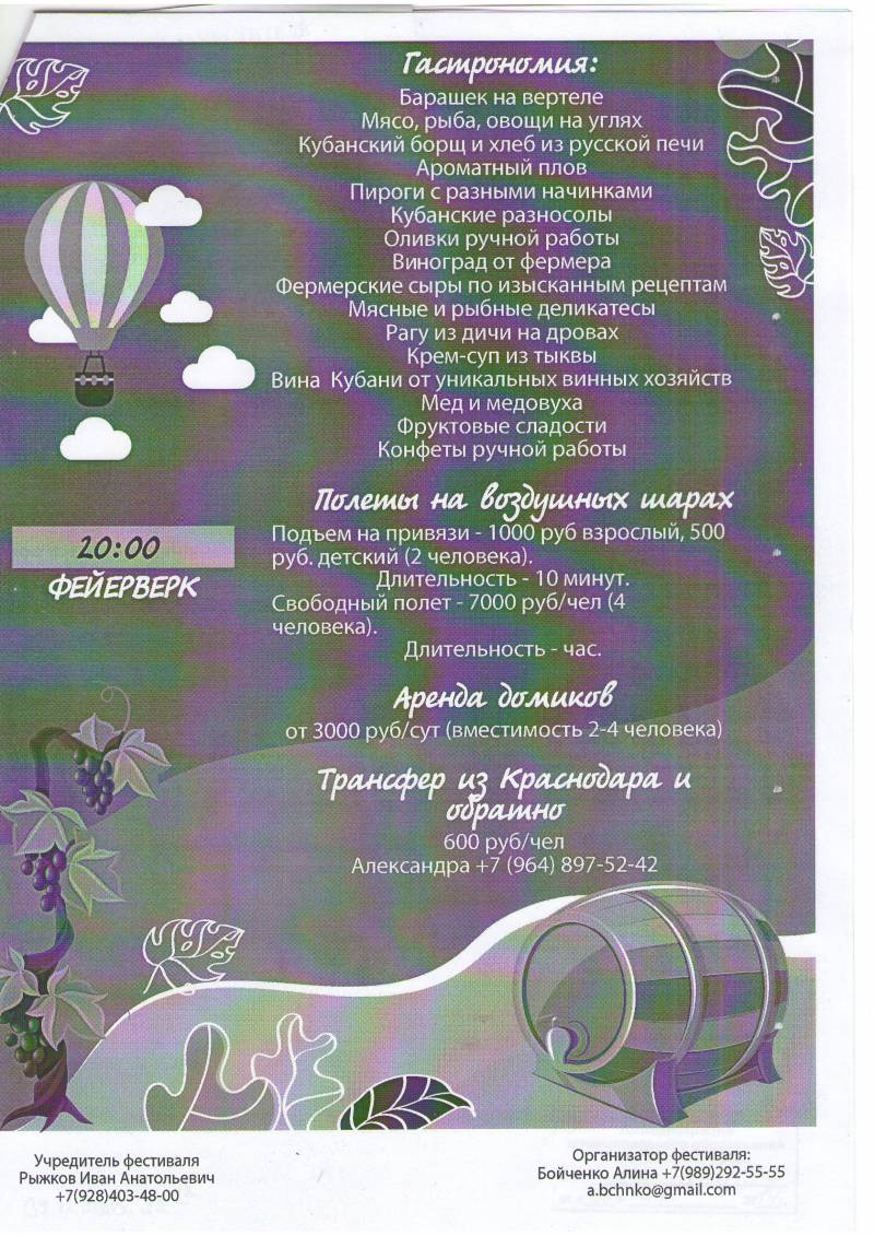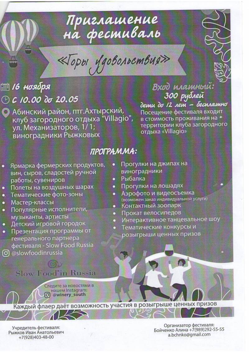 | Информируем Вас, о том , что 16 ноября 2019 года с 10:00 до 20:05 будет проводиться гастрономический фестиваль «Горы удовольствия»,который пройдет на территории клуба загородного отдыха «Villagio» Краснодарского края , Абинского района, пгт.Ахтырский, ул.Механизаторов 1/1 виноградники Рыжковых. Целью мероприятия является привлечение населения края к товарам кубанских производителей, их популяризация в интересах импортозамещения. Более точную информацию можно получить у организатора фестиваля: Бойченко Алина +7989-292-55-55 (a.bchnko@gmail.com), или у учредителя фестиваля: Рыжков Иван Анатольевич +7928-403-48-00. Приложение (Программа фестиваля) на 2листах. Стрюкова Юлия Юрьевна 8(86144)3-41-71 | |