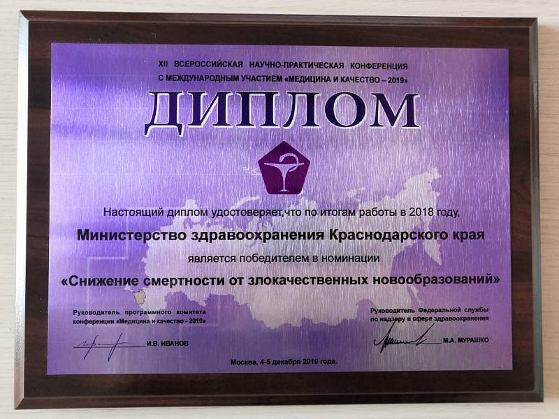 Дата публикации: 5 декабря 2019 ![]() Министерство здравоохранения Кубани отмечено дипломом Росздравнадзора. Минздраву региона вручена премия «За качество и безопасность медицинской деятельности». Среди всех субъектов РФ край стал победителем в номинации «Снижение смертности от злокачественных новообразований». Церемония награждения состоялась в рамках XII Всероссийской научно-практической конференции с международным участием «Медицина и качество – 2019». На этом мероприятии ежегодно подводят итоги развития отрасли в стране. Как прокомментировал министр здравоохранения Кубани Евгений Филиппов, в крае проводится масштабная профилактическая работа, которая дает результат. – Уже сегодня в регионе онкологи диагностируют и выявляют рак на ранней стадии почти в 60% всех случаев заболеваний, когда лечение наиболее эффективно, – сообщил он. Евгений Филиппов выразил благодарность медработникам края за профессионализм. – Эта высокая награда – результат многолетней целенаправленной работы не только онкологической службы, но и всего здравоохранения Краснодарского края, – сказал министр. Напомним, что за последние пять лет онкослужба Кубани получила 5,6 тыс. единиц нового оборудования на 5 млрд рублей. В том числе КТ, МРТ, маммографы, УЗИ, ретгенаппараты, флюорографы. В рамках нацпроекта «Здравоохранение» реализуется региональный проект «Борьба с онкологическими заболеваниями». В этом году благодаря ему открылись 11 центров амбулаторной онкологической помощи, еще 7 появится в следующем году. Значительные средства выделяются на химиотерапию, увеличилось использование дорогостоящих схем лечения онкобольных, проводятся выездные мероприятия онкологов профилактического проекта «Кубань против рака». Пресс-служба администрации Краснодарского края | |||||||||||||||||||||||||||||||||||||||||||||||||||||||||||||||||||||||||||