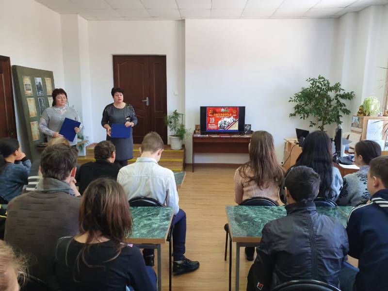 | 11 февраля библиотекари муниципального казенного учреждения культуры «Отрадненской межпоселенческой центральной библиотеки» в рамках месячника оборонно-массовой и военно-патриотической работы провели два массовых мероприятия. Гостями библиотеки стали ученики муниципального общеобразовательного учреждения Отрадненской вечерней (сменной) общеобразовательной школы. Для ребят был подготовлен урок мужества – «Афганский репортаж», посвященный 31-й годовщине вывода ограниченного контингента советских войск из Республики Афганистан. Ребята узнали о причинах ввода советских войск в Афганистан, о совместных военных действиях советских войск и правительственных войск Афганистана, о мужестве и отваге советских воинов, о трудных условиях, в которых приходилось воевать и о помощи, оказываемой советскими воинами местным жителям. На фоне общих сведений об Афганистане, вспомнили о наших погибших земляках: Пискунове С. Н., Зайцеве С. И., Жаркове Г. А., Алтунян Л. Л., Аулове С. В., Апанасенко Н. М., Геросименко П. П., Бугулове Р. Б. В этот же день, библиотекарь МКУК «ОМЦБ», провела урок мужества «Живая памяти нить» посвященный освобождению города Краснодара от немецко-фашистских захватчиков. Мероприятие состоялось в МБОУСОШ № 2, станицы Попутной для учеников 8-го класса. Учащимся в наглядной презентационной форме было рассказано о тяжёлом для всех жителей Кубани периоде гитлеровской оккупации. Так же ребятам было рассказано о тяжелых боях за Кубань, о героях, чьи имена на всю жизнь останутся в памяти каждого ныне живущего человека, о тяжёлом труде кубанских женщин в тылу, на плечи которых выпало снабжение фронта всем необходимым, а также послевоенное восстановление разрушенного хозяйства края. Весь материал сопровождался видеофрагментами и хрониками, времен Великой Отечественной войны. Завершающей частью мероприятия стало написание письма-треугольника, в рамках литературно-публицистического патриотического проекта "Солдатский треугольник". Хотелось бы отметить, что среди ребят равнодушных не оказалось, они с воодушевлением приняли участие в проекте. | |