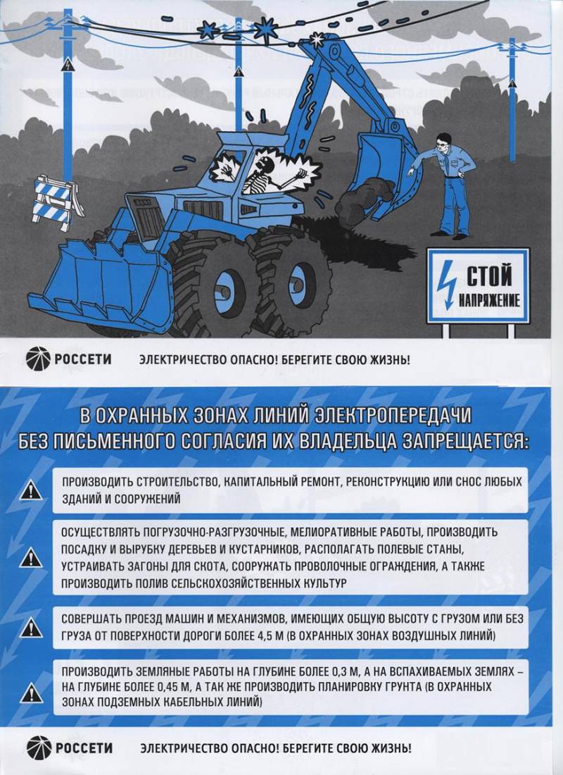 Охранная зона воздушной линии электропередачи – это зона вдоль линии в виде земельного участка и воздушного пространства, ограниченная вертикальными плоскостями, отстоящими по обе стороны линии от крайних проводов на расстоянии для воздушной линии электропередачи: до 1 кВ – 2 м; 6 –10 кВ – 10 м; 35 кВ – 15 м; 110 кВ – 20 м. В охранных зонах запрещается осуществлять любые действия, которые могут нарушить безопасную работу объектов электросетевого хозяйства, в том числе привести к их повреждению или уничтожению, повлечь причинение вреда жизни, здоровью граждан и имуществу физических или юридических лиц, а также повлечь нанесение экологического ущерба и возникновение пожаров. В ПРЕДЕЛАХ ОХРАННЫХ ЗОН БЕЗ ПИСЬМЕННОГО СОГЛАСОВАНИЯ С СЕТЕВЫМИ ОРГАНИЗАЦИЯМИ ЗАПРЕЩАЮТСЯ: Полевые работы с применением с/х машин и оборудования высотой более 4 метров или работы, связанные со вспашкой земли. Полив с/х культур в случае, если высота струи воды может составить свыше 3 метров. Строительство, ремонт, реконструкция или снос зданий и сооружений. Земляные работы на глубине более 0,3 метра (на вспахиваемых землях на глубине более 0,45 метра). Горные, взрывные, мелиоративные работы. Посадка и вырубка деревьев и кустарников. Дноуглубительные, землечерпальные и погрузочно-разгрузочные работы. Проезд машин и механизмов, имеющих общую высоту с грузом или без груза от поверхности дороги более 4,5 метра. Остановка, заправка, ремонт машин и механизмов под действующими ЛЭП. В случае обнаружения оборванного, висящего или лежащего на земле электрического провода, а также повреждённой опоры просим немедленно сообщать на телефон горячей линии компании «Россети Кубань» 8-800-100-15-52. До прибытия специализированной бригады запрещается предпринимать какие-либо самостоятельные действия по устранению выявленных повреждений, это угрожает жизни людей. ПОМНИТЕ, электрический ток представляет смертельную опасность для жизни и здоровья людей! | |