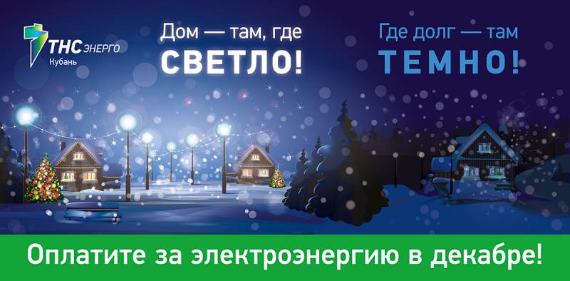 «ТНС энерго Кубань» информирует своих клиентов о том, что долги населения перед гарантирующим поставщиком электроэнергии в регионе составляют более 1,7 млрд. рублей. Несмотря на сложную эпидемиологическую обстановку в период коронавируса COVID-19 и существенно снизившуюся платежную дисциплину потребителей, компания круглосуточно продолжает обеспечивать стабильное и надежное энергоснабжение в регионе. Оплатить счёт за электроэнергию и передать показания можно удобным для вас способом: - без регистрации на сайте kuban.tns-e.ru; - с регистрацией в личном кабинете или мобильном приложении «ТНС энерго»; - через онлайн-приложения Сбербанка и других партнеров компании. Обращаем внимание, что согласно постановлению Правительства РФ № 424 от 02.04.2020 приостановление права требовать уплату пени и производить отключение услуг действует до 1 января 2021 года! При этом данное постановление не освобождает граждан от оплаты коммунальных услуг и сохраняет право ресурсоснабжающих организаций взыскивать задолженности через суд. НАЧНИТЕ НОВЫЙ ГОД БЕЗ ДОЛГОВ! | |
