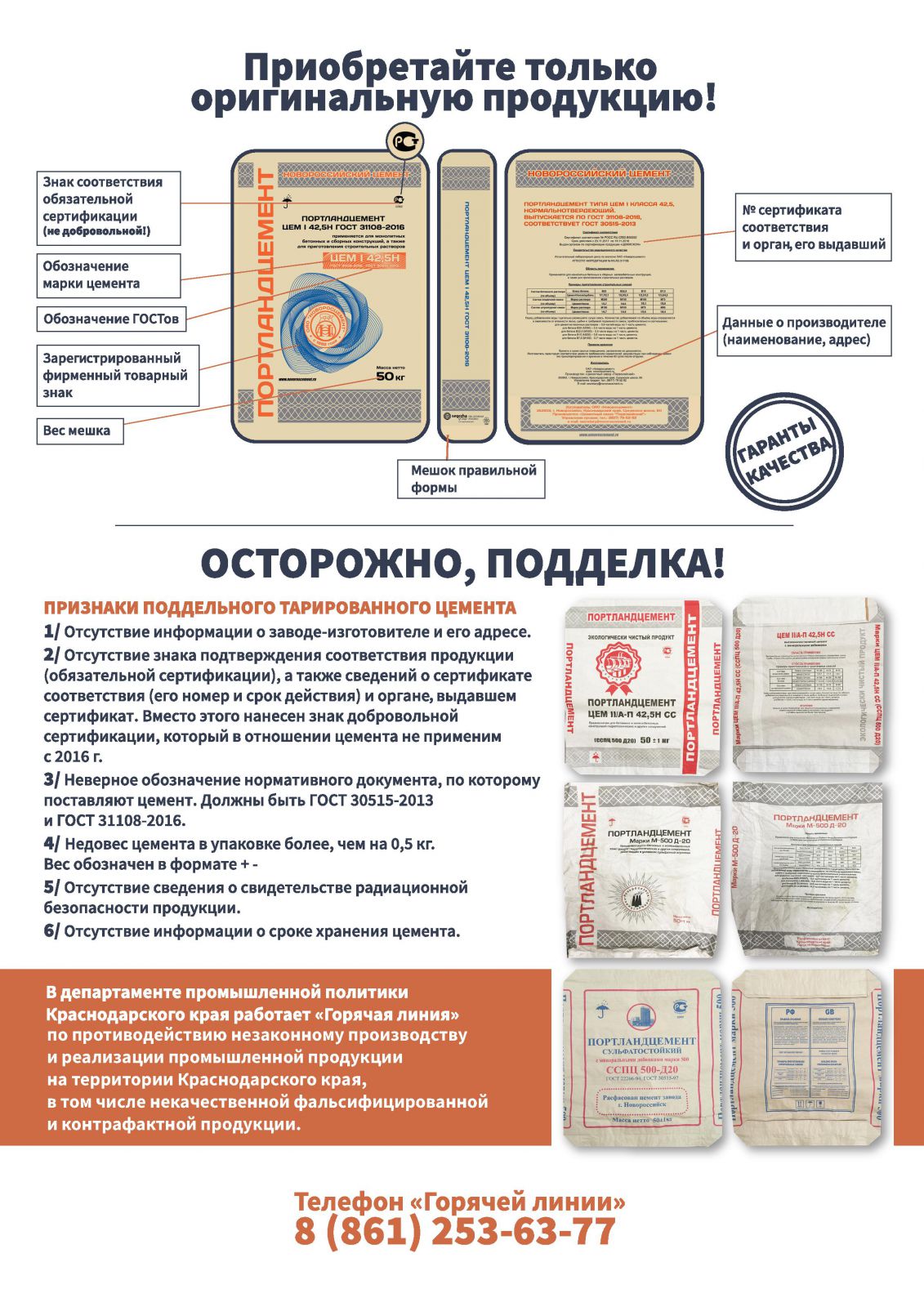 В последнее время на Кубани участились случаи реализации некачественного, фальсифицированного цемента. Контрафактный цемент — это цемент, разбавленный материалом, не обладающим качествами для того, чтобы достигнуть необходимой прочности. Поэтому, как минимум, тот, кто его применяет, получит меньшую прочность конструкции, меньшую долговечность. Такие конструкции могут разрушаться под природными нагрузками либо под нагрузками от каких-либо конструкций. Как же определить, где оригинальный качественный цемент, а где опасная подделка? На подделке может: отсутствовать информация о заводе-изготовителе и его адрес; отсутствовать знак подтверждения соответствия продукции, сведения о сертификате соответствия – вместо этого нанесен знак добровольной сертификации (в отношении цемента не применим с 2016 г.); неверно обозначен нормативный документ, по которому поставляется цемент; недовес цемента в упаковке более чем на 0,5 кг; отсутствовать сведения о радиационной безопасности; отсутствовать информация о сроке хранения. В департаменте промышленной политики Краснодарского края @dppkk23 работает «Горячая линия» незаконного производства и реализации промышленной продукции на территории Краснодарского края, в том числе некачественной, фальсифицированной и контрафактной продукции. Телефон «Горячей линии»: 8 (861) 253-63-77. | |