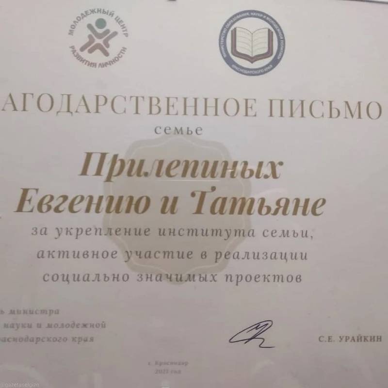| Молодой депутат Отрадненского района Татьяна Прилепина вместе со своей семьей одержали победу в краевом фотоконкурсе «Семья Кубани», который состоялся в онлайн- формате, посвященный Дню семьи, любви и верности. Семья Татьяны Прилепиной была награждена благодарностью заместителя министра образования, наук и молодежной политики Сергея Евгеньевича Урайкина за укрепление института семьи, активное участие в реализации социально значимых проектов. Татьяна и Евгений вместе уже много лет. Со слов Татьяны, детей они учат быть честными, справедливыми и ответственными, помнить свои «корни». Одним из главных праздников семьи является День Победы. В семье Татьяны и Евгения есть свои традиции: они часто говорят с детьми на патриотические темы, просматривают документальные и художественные фильмы о Великой Отечественной войне, чтобы дети понимали, какой ценой далась Победа нашему народу. Семья Прилепиных ведет активный образ жизни. В свободное время Татьяна занимается спортом, играет в баскетбол, защищая честь Удобненского поселения на районных соревнованиях. | |