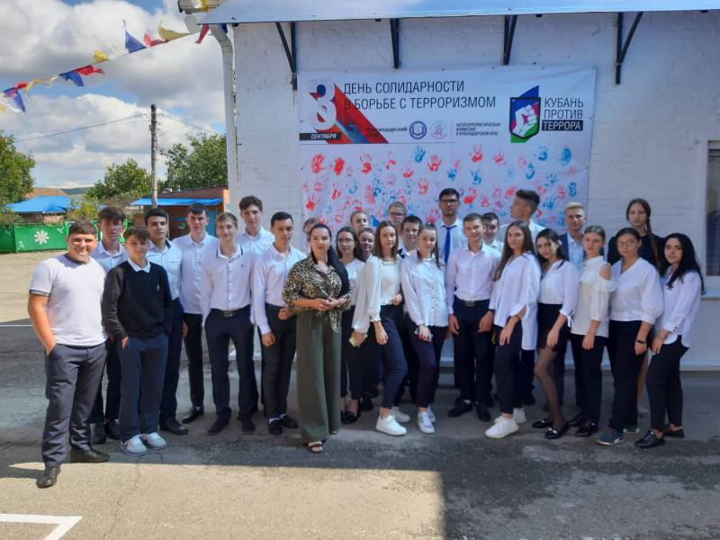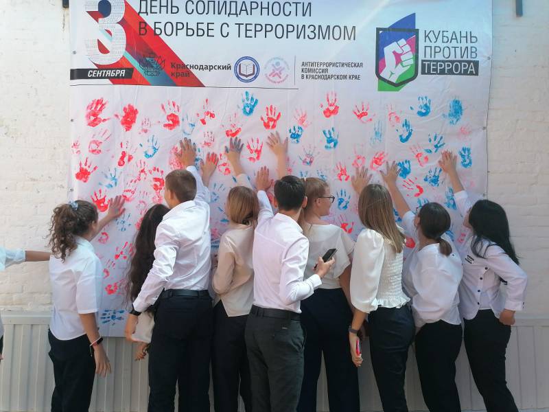 | Третьего сентября в календаре нашей страны особая памятная дата - «День солидарности в борьбе с терроризмом». На сегодняшний день борьба с терроризмом – важнейшая государственная задача. Предпринимаются эффективные меры по пресечению терроризма и созданию эффективной общегосударственной системы противодействия ему. Для эффективного противодействия террористической угрозе в профилактическую работу должны включаться не только представители правоохранительных и административных органов власти, но и каждый из нас. Именно поэтому сегодня молодой депутат Отрадненского района Анжелика Андреевна Ковалева и капитан полиции ОМВД России по Отрадненскому району Дарья Николаевна Духнова провели для учащихся МБОУ СОШ №1 имени А.С. Колесника профилактическую беседу и призвали вспомнить всех жертв террористических актов на территории России – мирных жителей и сотрудников органов правопорядка. В рамках мероприятия проведена памятная акция с использованием баннера и меловой краски. Каждый участник оставил отпечаток руки на баннере, что олицетворяет память каждого человека о жертвах этих трагических событий. | |