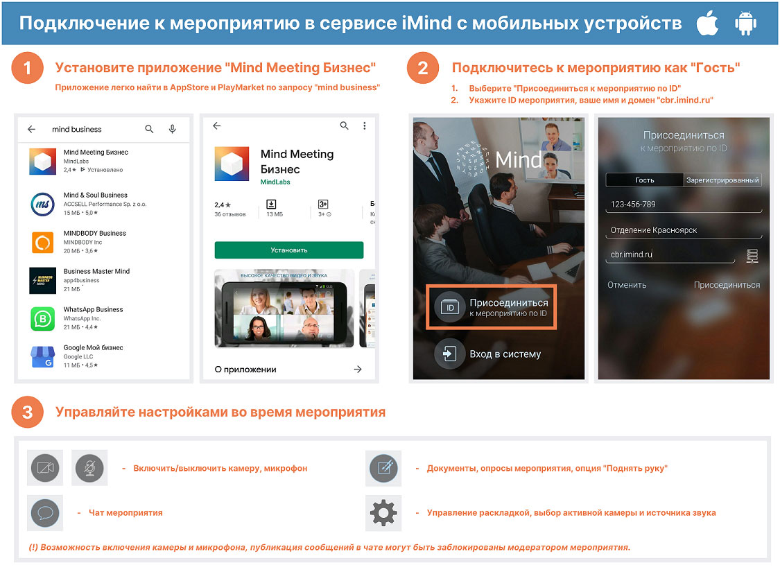 Дата проведения: 08.09.2021 с 11:00 до 12:30 (мск) Проверка технических средств: за 1ч до начала мероприятия К мероприятию можно подключиться двумя способами: Через браузер с рабочего места. Для этого выполнить следующие действия: Для входа через браузер (рекомендуется Google Chrome) с рабочего места, подключенного к сети Internet пройдите по ссылке: https://cbr.imind.ru/ Перейдите на вкладку «Подключиться к мероприятию по ID». В поле «ID мероприятия» введите значение 775-118-639 и нажмите кнопку «Продолжить». Выберите вкладку "Я не зарегистрирован в системе". В Поле "Имя" введите наименование своего подразделения (например, «Отделение Красноярск»). Нажмите кнопку "Войти в мероприятие". Используя мобильное приложение. Инструкция по скачиванию приложения и подключению к мероприятию приложена ниже. При подключении просьба учитывать, что комната защищена паролем, который снимается перед началом тестирования! Техническую поддержку осуществляет ОЭЦ Воронеж: Тел. ГТС: +7(473)269-99-00 Уважаемые представители бизнеса! Проект программы совещания «Система быстрых платежей для бизнеса» для субъектов МСП Краснодарского края 8 сентября 2021 года Система быстрых платежей для МСП Зачем бизнесу подключаться к СБП?. | |