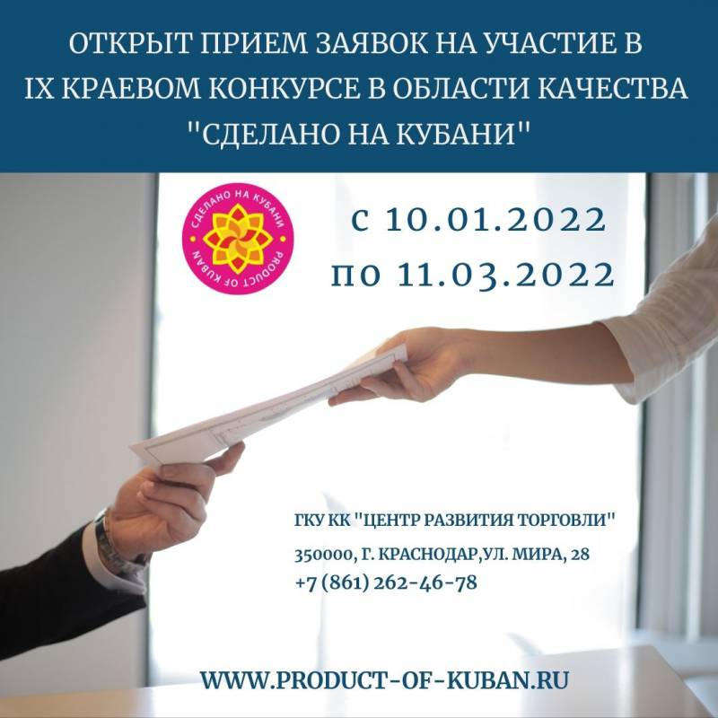 10 января 2022 г. стартовал прием заявок на участие в IX краевом конкурсе в области качества "Сделано на Кубани"