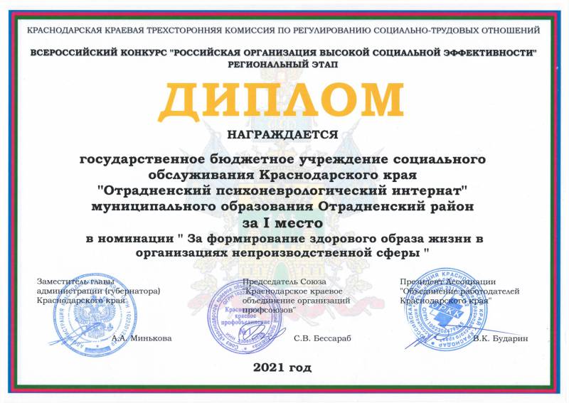 | Государственное бюджетное учреждение Краснодарского края «Отрадненский психоневрологический интернат» (руководитель Захарова Наталья Васильевна), заняло первое место в региональном этапе Всероссийского конкурса «Российская организация высокой социальной эффективности» в 2021 году в номинации «За формирование здорового образа жизни в организациях непроизводственной сферы». Это заслуженная победа руководства, профсоюзной организации и всего коллектива учреждения! Вручение диплома состоялось в Краевой администрации 08 апреля 2022 года на заседании трехсторонней комиссии по регулированию социально – трудовых отношений. Диплом вручала заместитель главы (губернатора) администрации Краснодарского края А.А. Минькова. | |