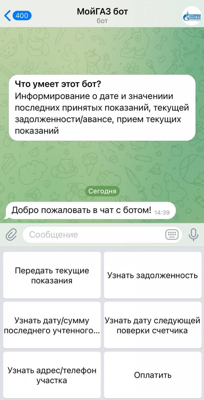 Так, абоненты-пользователи мессенджера Telegram могут решать газовые вопросы с помощью чат-бота. Интерфейс виртуального помощника позволяет передать текущие показания счетчика, узнать задолженность и произвести оплату, уточнить дату и сумму последнего учтенного платежа, узнать дату следующей поверки счетчика, а также адреса и телефоны участков газовой компании. Для получения доступа к чат-боту абоненту необходимо в строке поиска мессенджера набрать имя бота my_gaz_bot, и он сохранится в списке контактов в приложении Telegram и будет доступен в любой момент. Все конфиденциальные данные сервис предоставляет только при введении номера лицевого счета абонента. | |