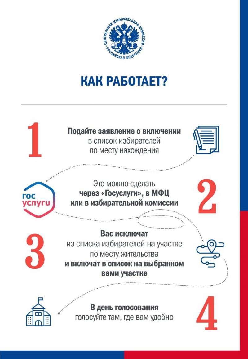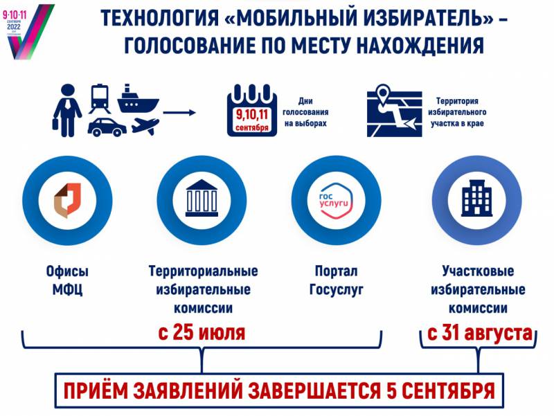 | 25 июля, стартует приём заявлений о голосовании по месту нахождения. Технология "Мобильный избиратель" позволяет избирателю проголосовать по месту нахождения. Если в дни голосования вы будете находиться на территории края, но вне пределов своего избирательного участка, то вы сможете принять участие в выборах на любом удобном для вас избирательном участке. Для этого нужно заранее подать заявление. Сегодня, 25 июля, стартовал прием таких заявлений. Для голосования по месту нахождения необходимо обратиться в любой офис МФЦ или в любой пункт приема заявлений на базе территориальных избирательных комиссий. Заявление также можно подать через портал Госуслуг. С 31 августа к приему таких заявлений подключатся все участковые избирательные комиссии. Голосование по месту нахождения позволяет принимать участие в выборах депутатов регионального парламента, если вы будете находиться с 9 по 11 сентября в путешествии или командировке в пределах Краснодарского края. Голосуйте там, где удобно! | |