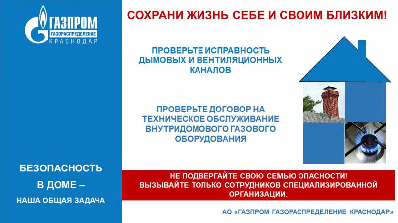 Едва только температура на улице начинает падать, как люди начинают забывают о необходимости соблюдения правил безопасного использования внутридомового/внутриквартирного газового оборудования. Нередко причиной трагедии становится самовольный перенос, установка или ремонт газовых приборов, проведенный неквалифицированными специалистами. Бывают случаи, когда дымоход забивается листьями. Так что надо брать пример с наших бабушек и дедушек — перед началом отопительного сезона, следует очищать дымоходы, срезать ветки, нависшие над дымоходом. Проверку состояния дымовых и вентиляционных каналов и при необходимости их очистку следует производить не реже 3 раз в год в течение отопительного периода (ОБЯЗАТЕЛЬНО перед началом отопительного сезона, в середине и сразу после завершения отопительного периода). Администрация Филиала №20 АО «Газпром газораспределение Краснодар» | |